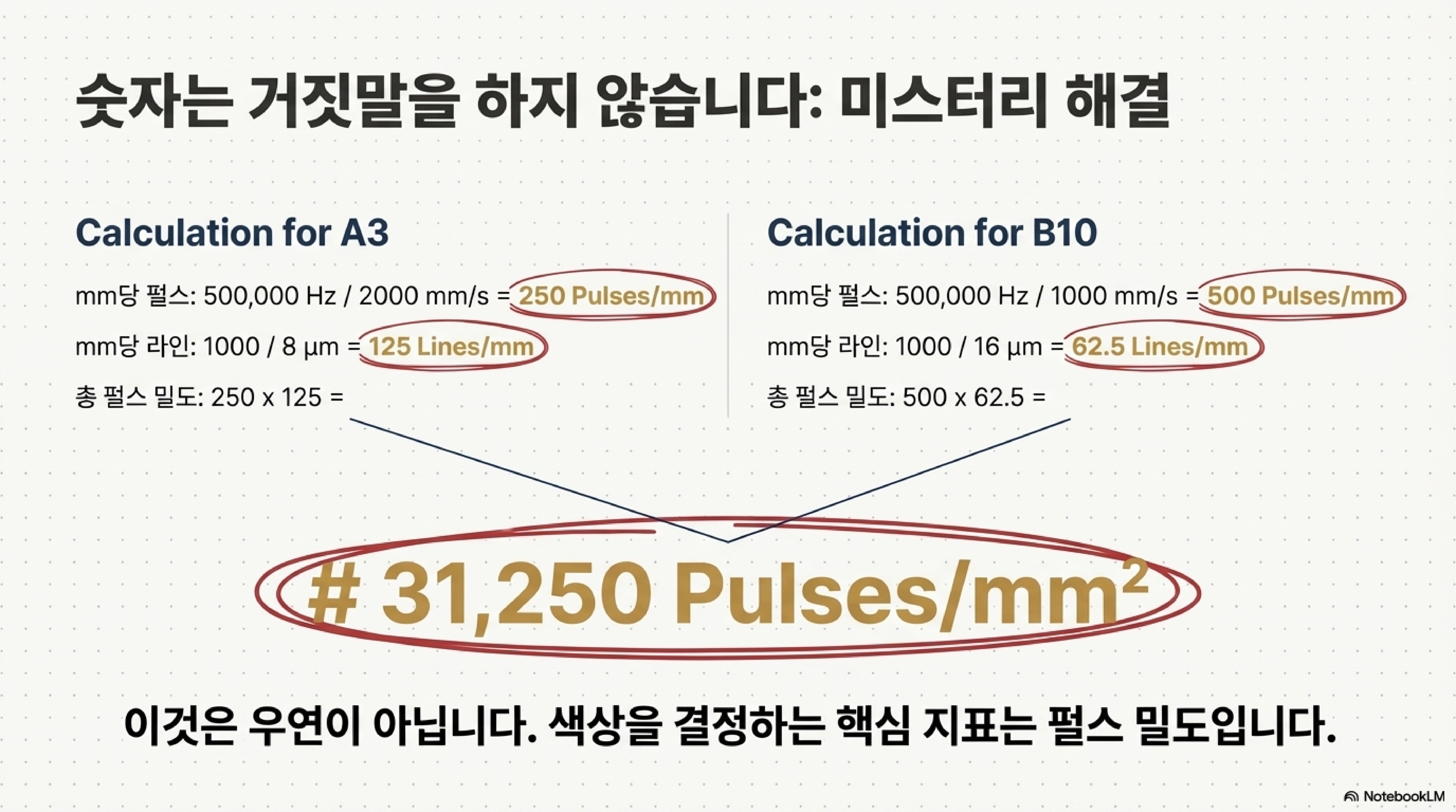 한쪽은 다른 쪽보다 속도가 두 배 빠르고, 라인 간격은 절반이었습니다. 처음에는 단순한 우연처럼 보였고, 실험자는 이 일치를 발견하고 거의 무시할 뻔했습니다. 하지만 수학적인 계산을 자세히 들여다보자 놀라운 연결고리가 드러났습니다. 두 설정의 제곱밀리미터당 총 레이저 펄스 수를 계산해보니, 놀랍게도 31,250개로 정확히 일치했던 것입니다.