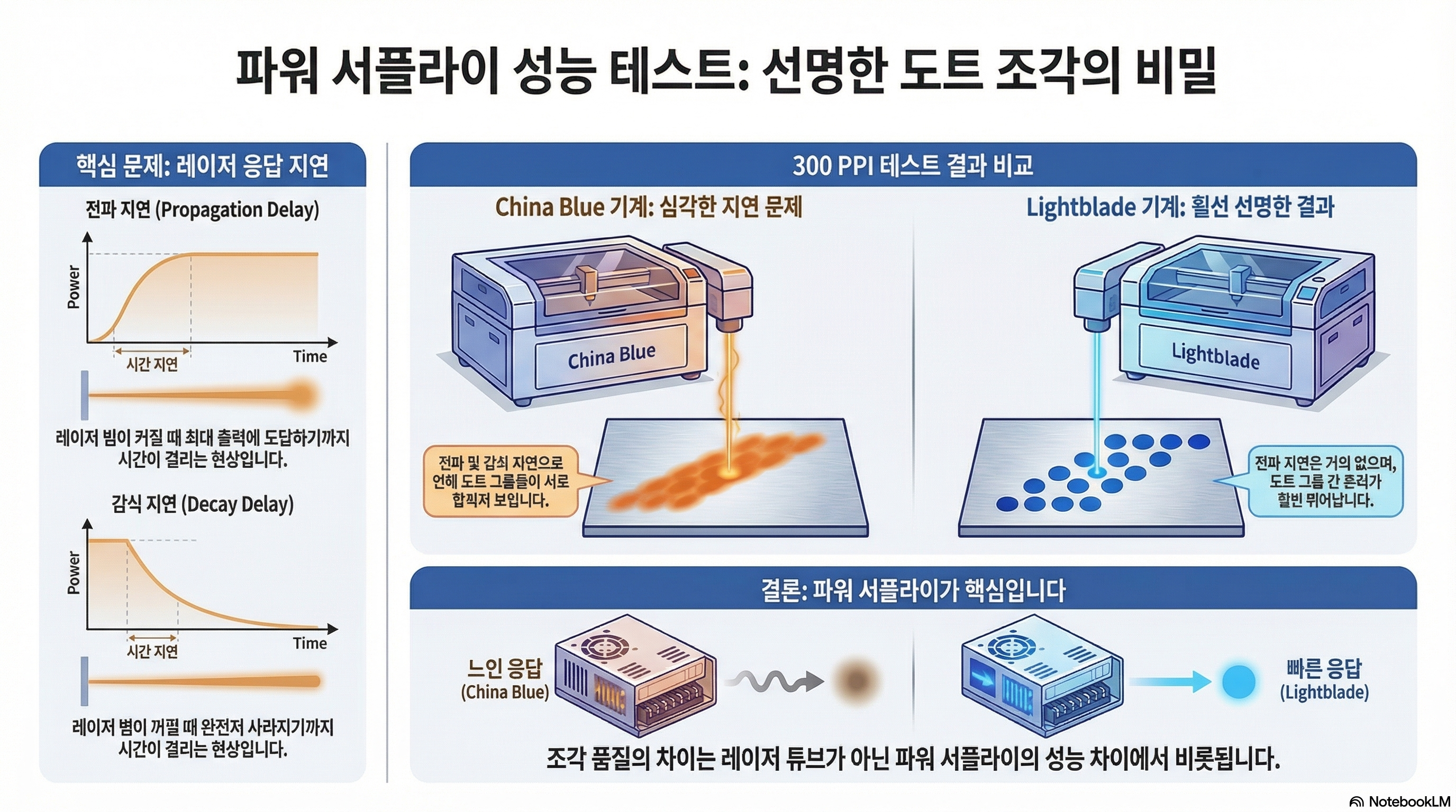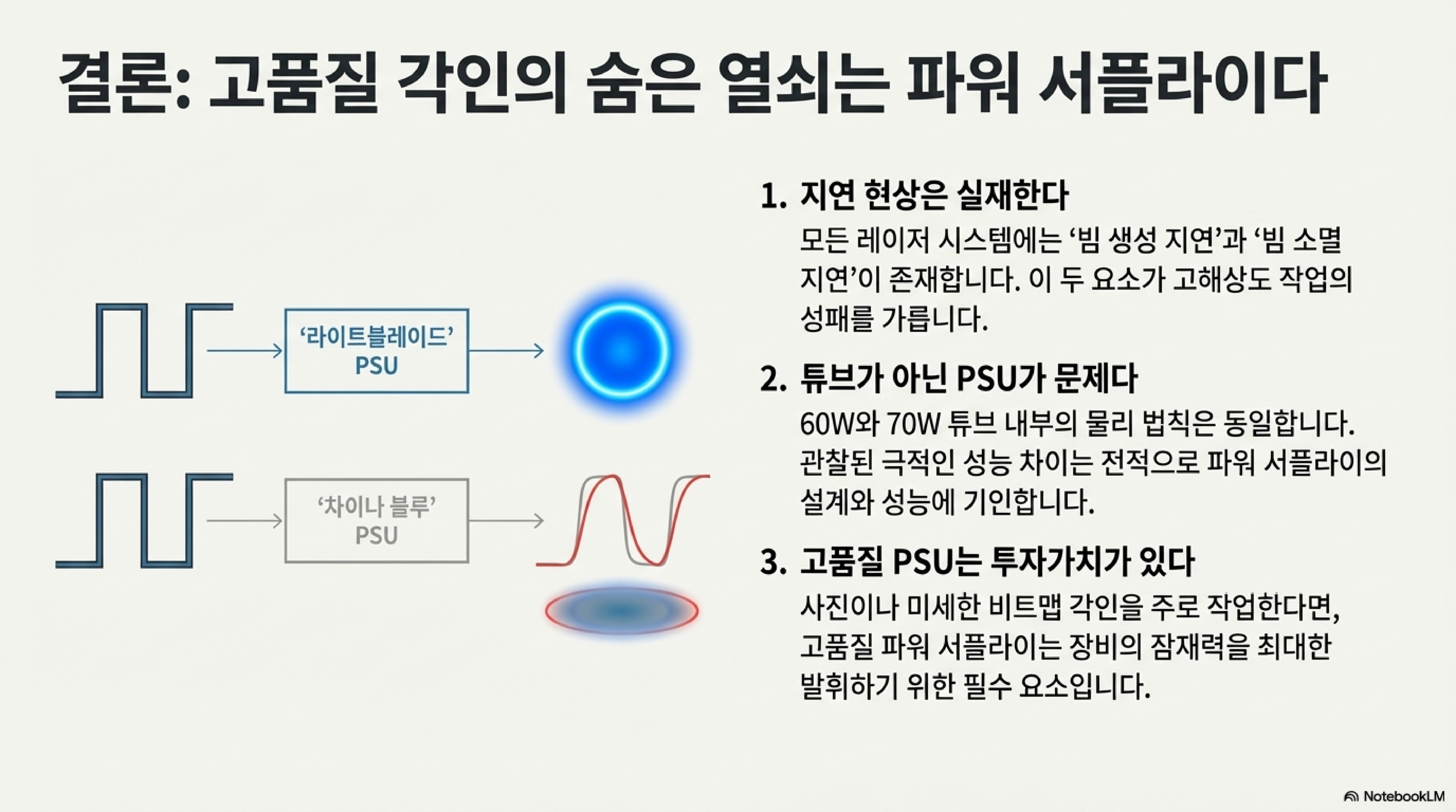 이 예상 밖의 결과는 우리를 단 하나의 논리적 결론으로 이끕니다. 레이저 튜브 내부에서 가스가 반응하는 물리 현상은 어떤 기계든 동일합니다. 그렇다면 이 성능 차이를 만드는 유일한 변수는 바로 기계의 심장, **"파워 서플라이의 설계와 성능"**이라는 것입니다.