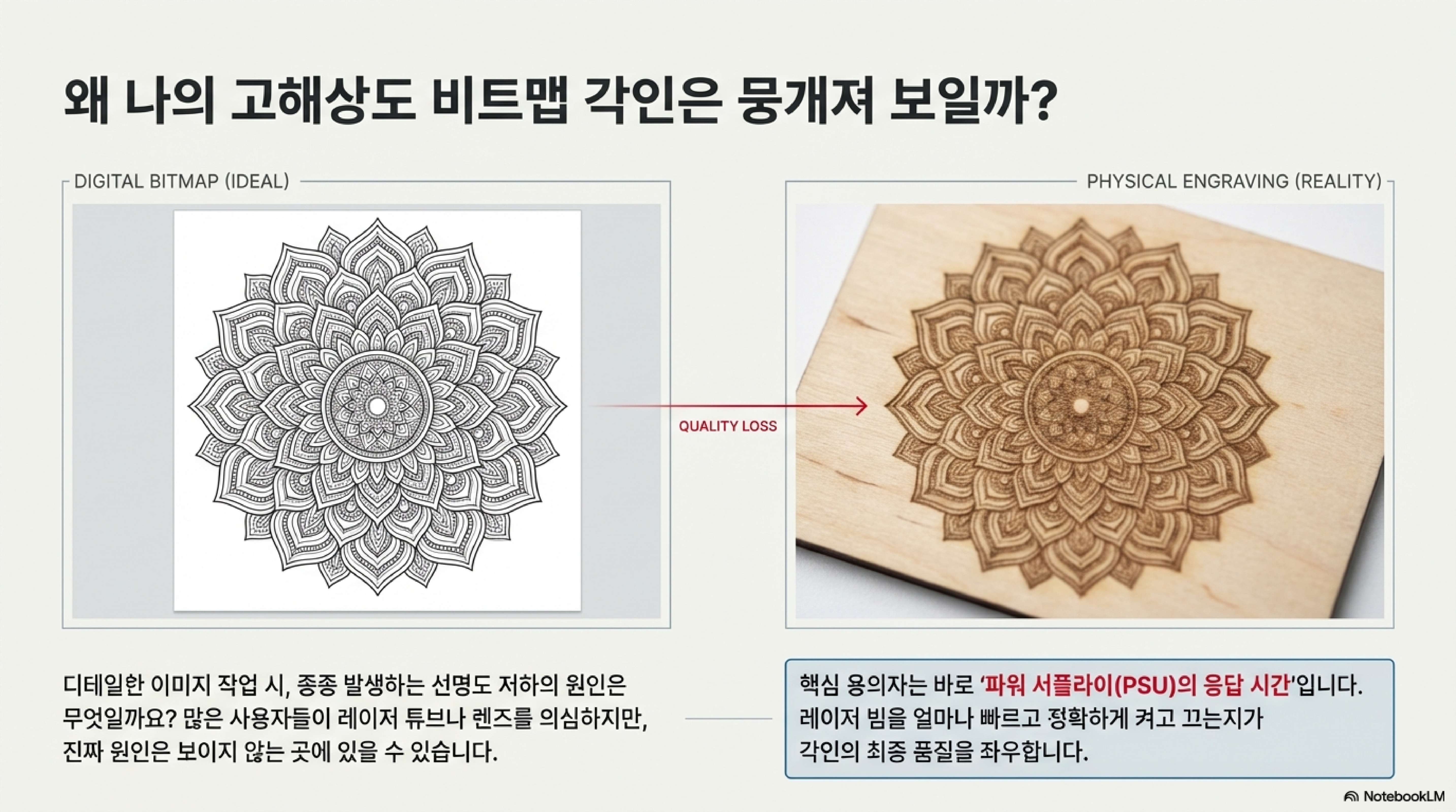 정밀한 도트 표현이 생명인 사진 조각에서, 이러한 '레이저의 관성'은 디테일이 뭉개지는 직접적인 원인이 됩니다. 당신이 겪었던 좌절의 기술적인 이유가 바로 여기에 있었습니다.