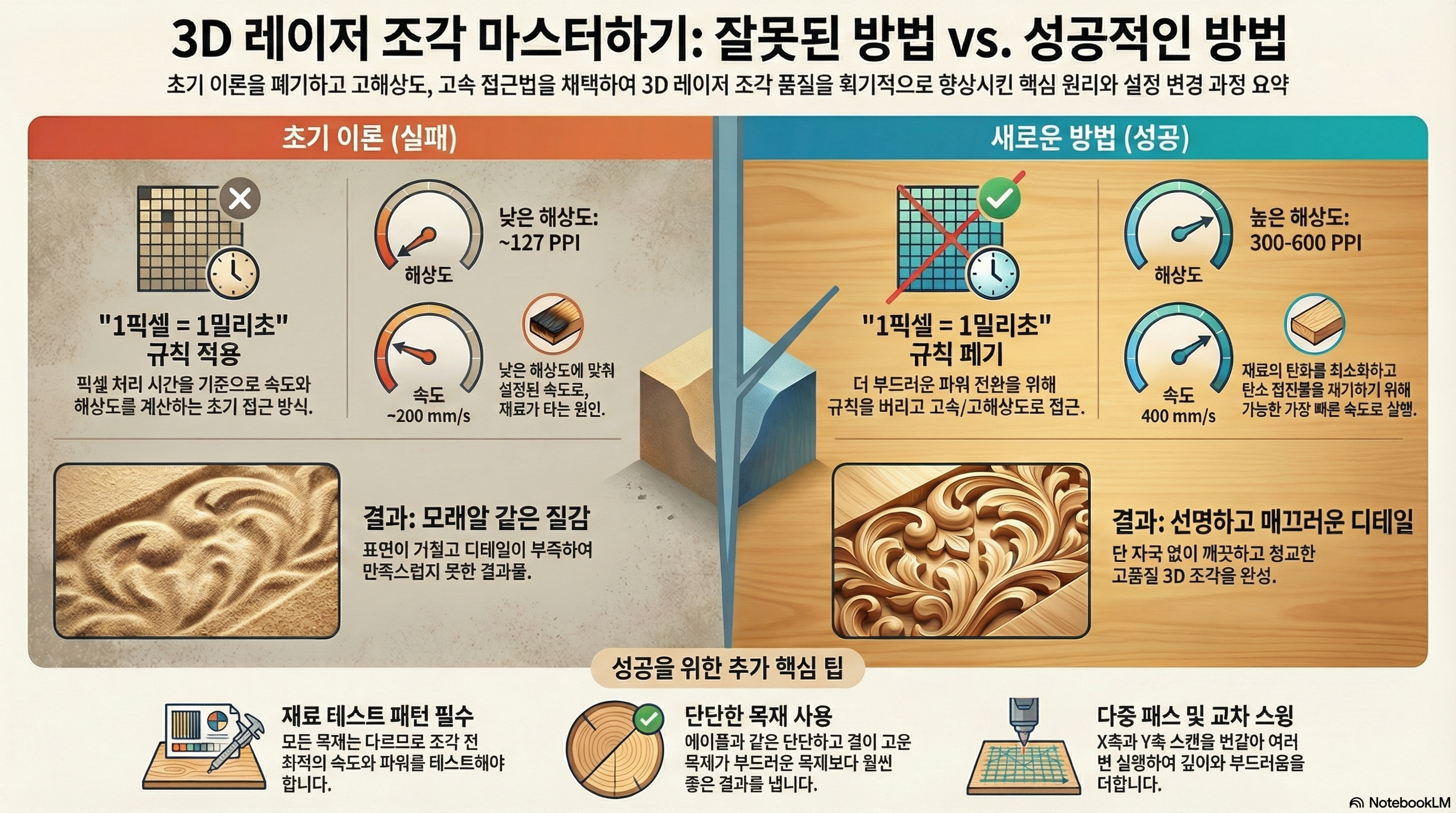 레이저 3D 조각에 도전해 본 분이라면 누구나 그 과정이 얼마나 어렵고 좌절감을 주는지 아실 겁니다. 저 역시 마찬가지였습니다. 18개월이라는 시간 동안, '끔찍할 정도로' 타버린 목재와 '모래알 같은' 질감의 결과물을 마주하며 길고 험난한 길을 걸어야 했습니다. 수많은 시행착오 끝에 마침내 그 원리를 꿰뚫게 되었고, 그 과정에서 기존의 통념을 완전히 뒤엎는 몇 가지 놀라운 사실들을 발견했습니다.