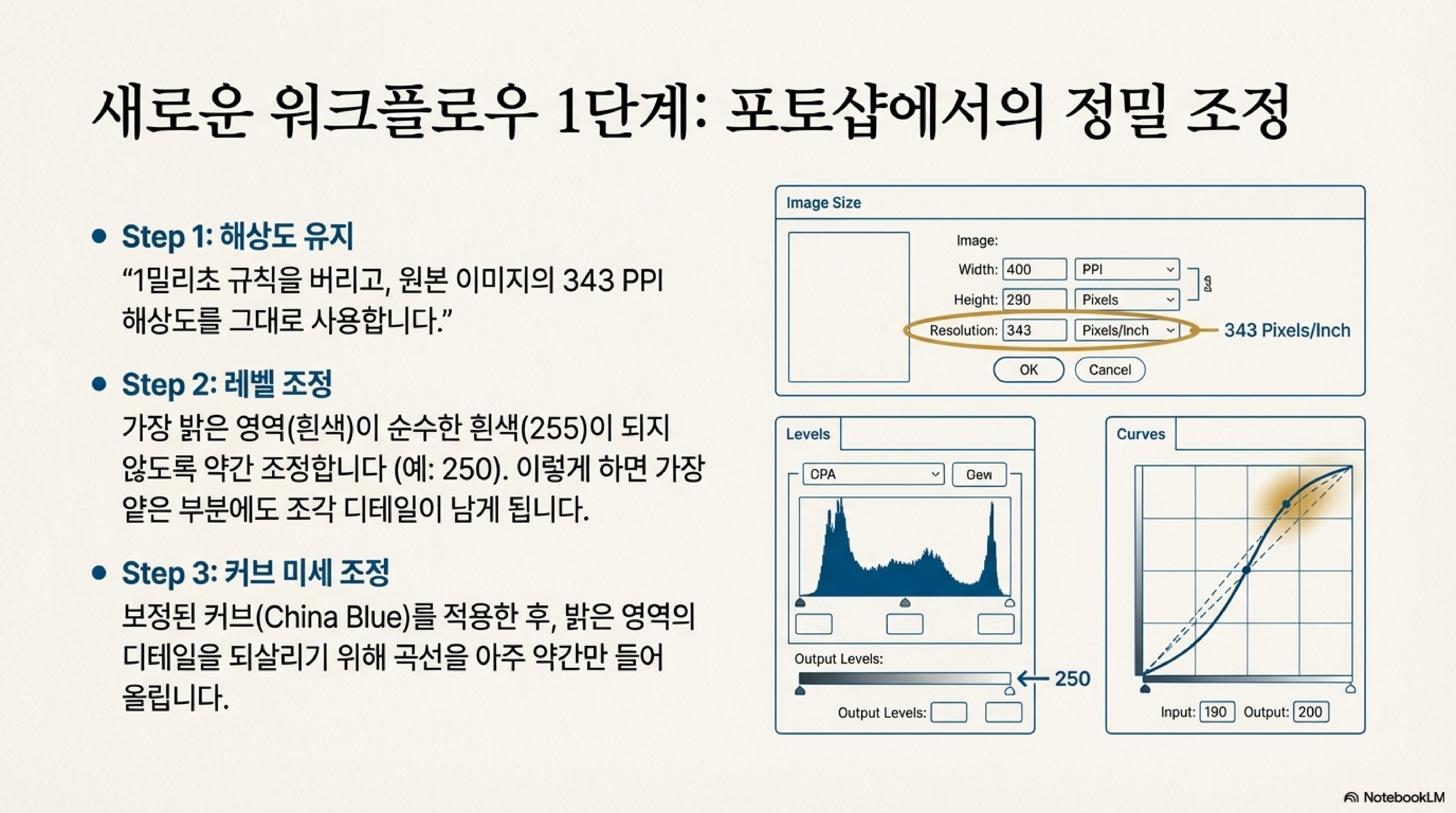 - 해상도: 이미지를 127 PPI로 다운샘플링하는 대신, 최종 테스트에서는 600 PPI까지 높였습니다.