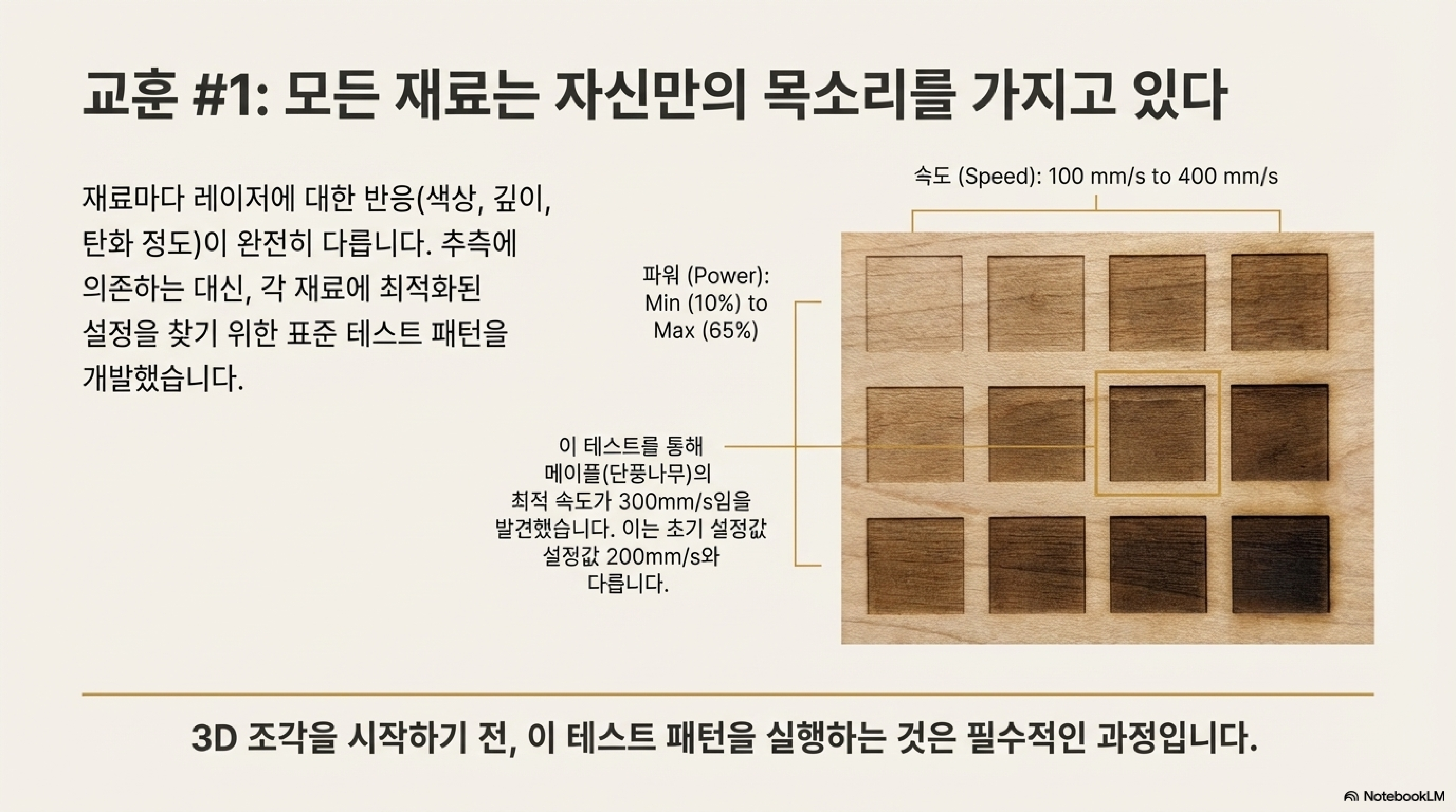본격적인 3D 조각 작업에 들어가기 전에, 사용할 재료에 작은 테스트 패턴을 실행하는 것은 선택이 아닌 필수입니다. 재료마다 레이저에 반응하는 방식이 천차만별이기 때문입니다.