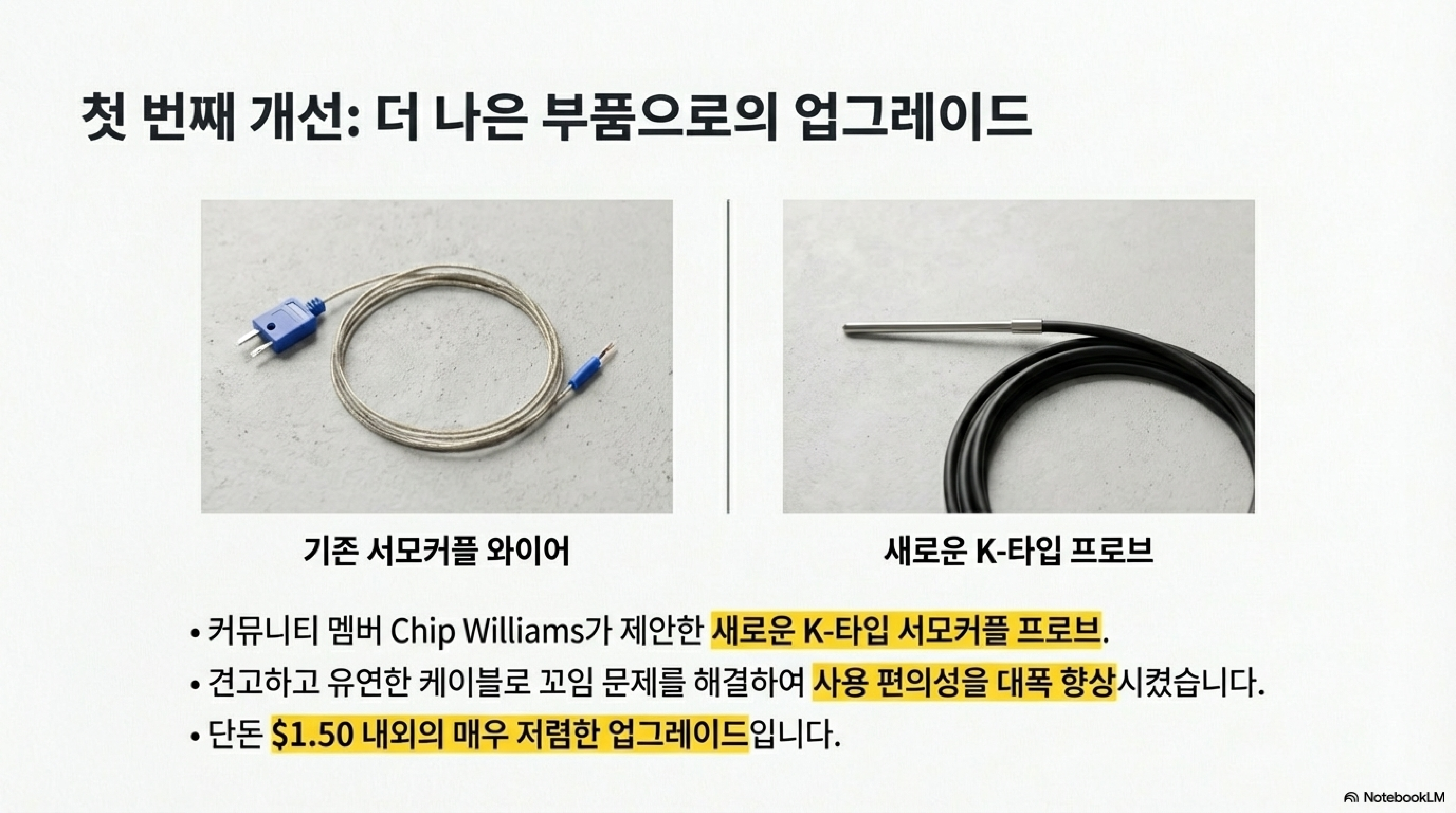 1단계: 첫 번째 업그레이드 칩 윌리엄스(Chip Williams)라는 사용자는 기존의 얇은 전선을 대체할 "훨씬 더 나은 해결책"을 제안했습니다. 바로 99펜스(약 1.5달러)에 불과한 저렴한 가격의 K-타입 열전대(thermocouple)였습니다. 이 부품은 깔끔하게 케이스에 담겨 있고 유연한 케이블이 달려 있어, 회전시킬 때마다 "꼬이고 꺾이는" 경향이 있던 기존 전선의 불편함을 완벽하게 해결해주었습니다. 구형 도히키 유닛에 이 부품을 장착하기 위해서는 구멍을 3.2mm로 조금 넓혀야 하는 작은 수정이 필요했지만, 이는 충분히 감수할 만한 개선이었습니다.