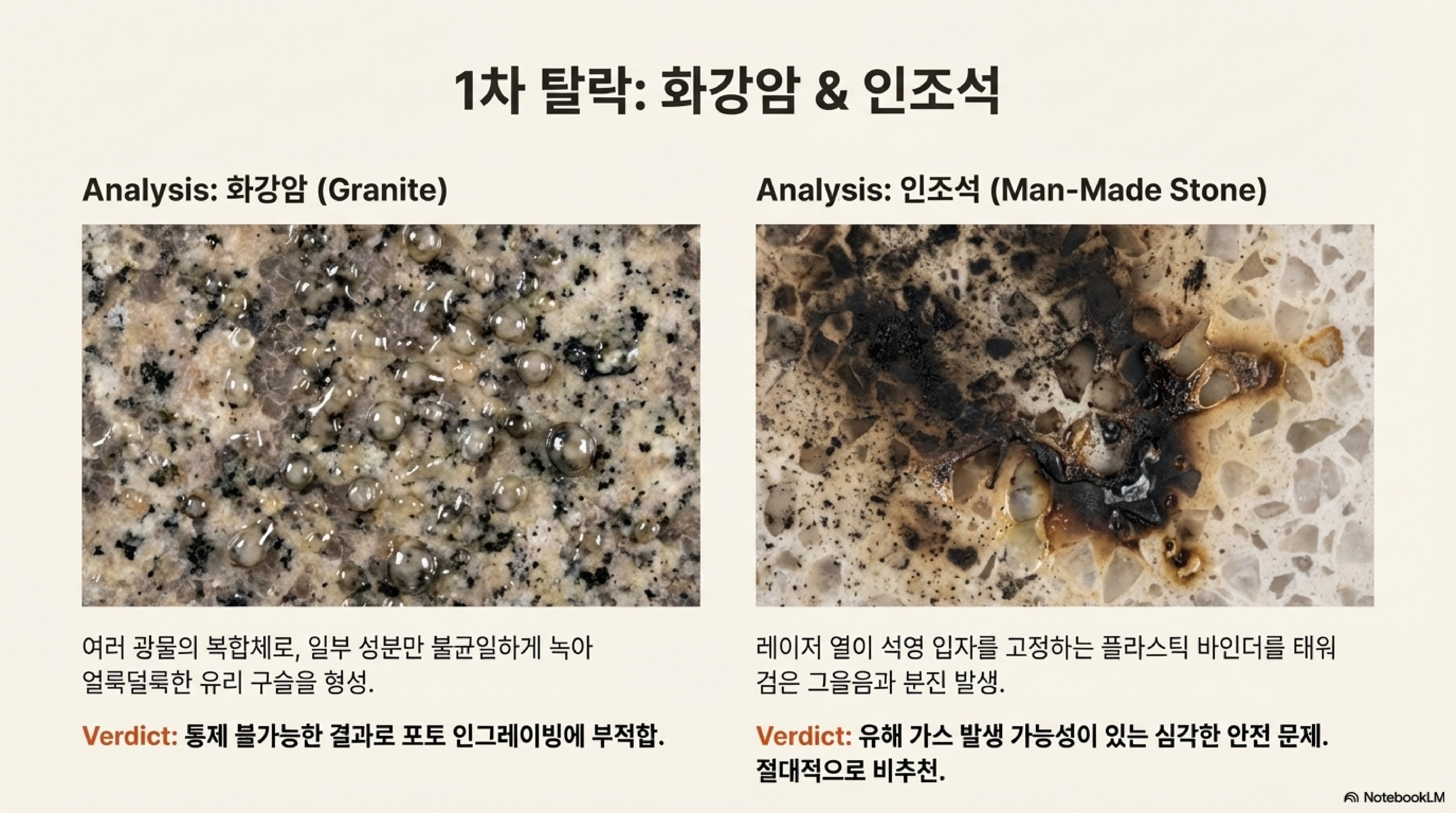 하지만 이런 표면적인 결과만으로는 충분하지 않았습니다. 슬레이트는 왜 성공했고 화강암은 왜 실패했는지, 그 근본적인 원인을 파헤치기 위해 우리는 현미경을 들여다봐야 했습니다.