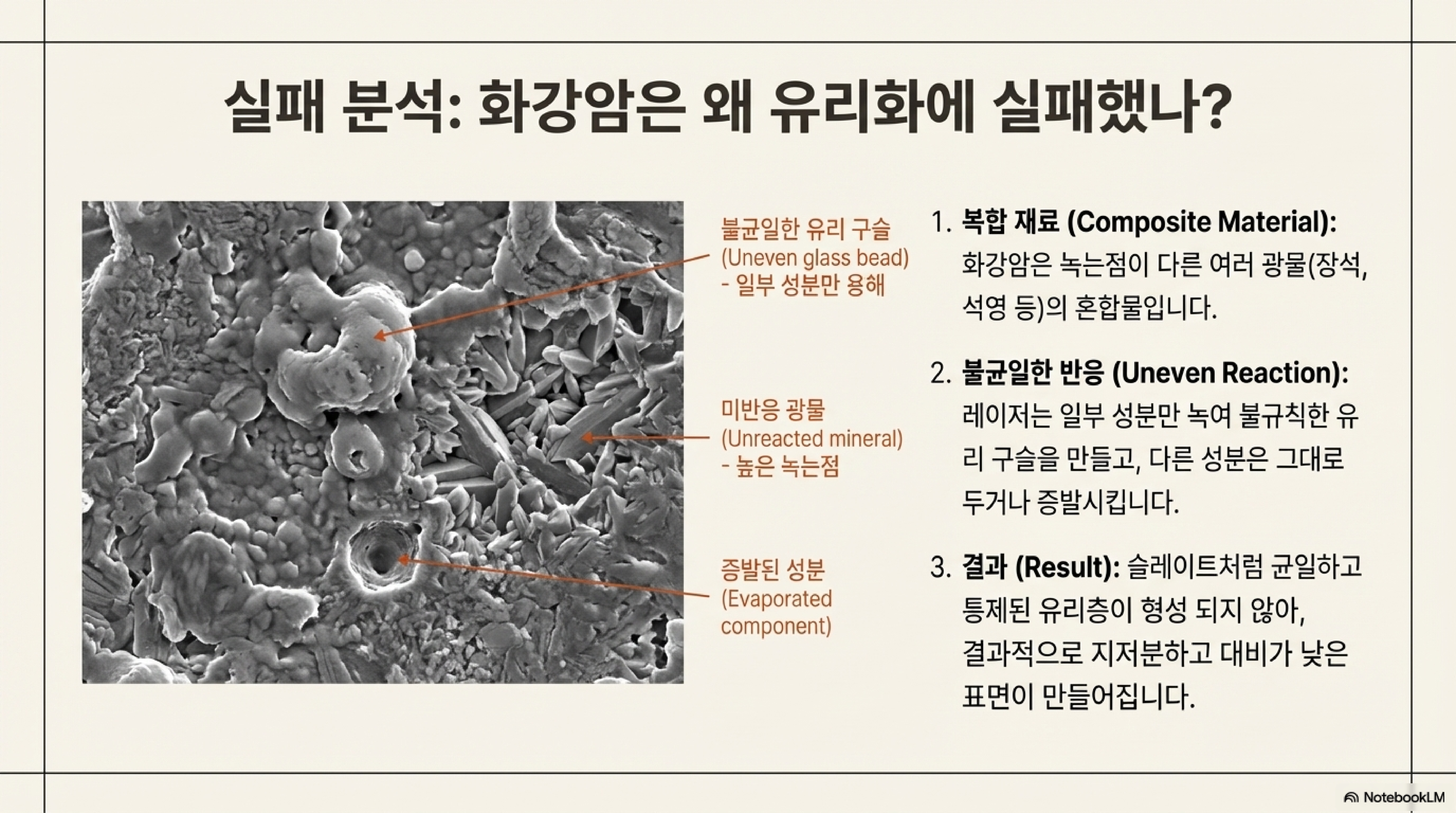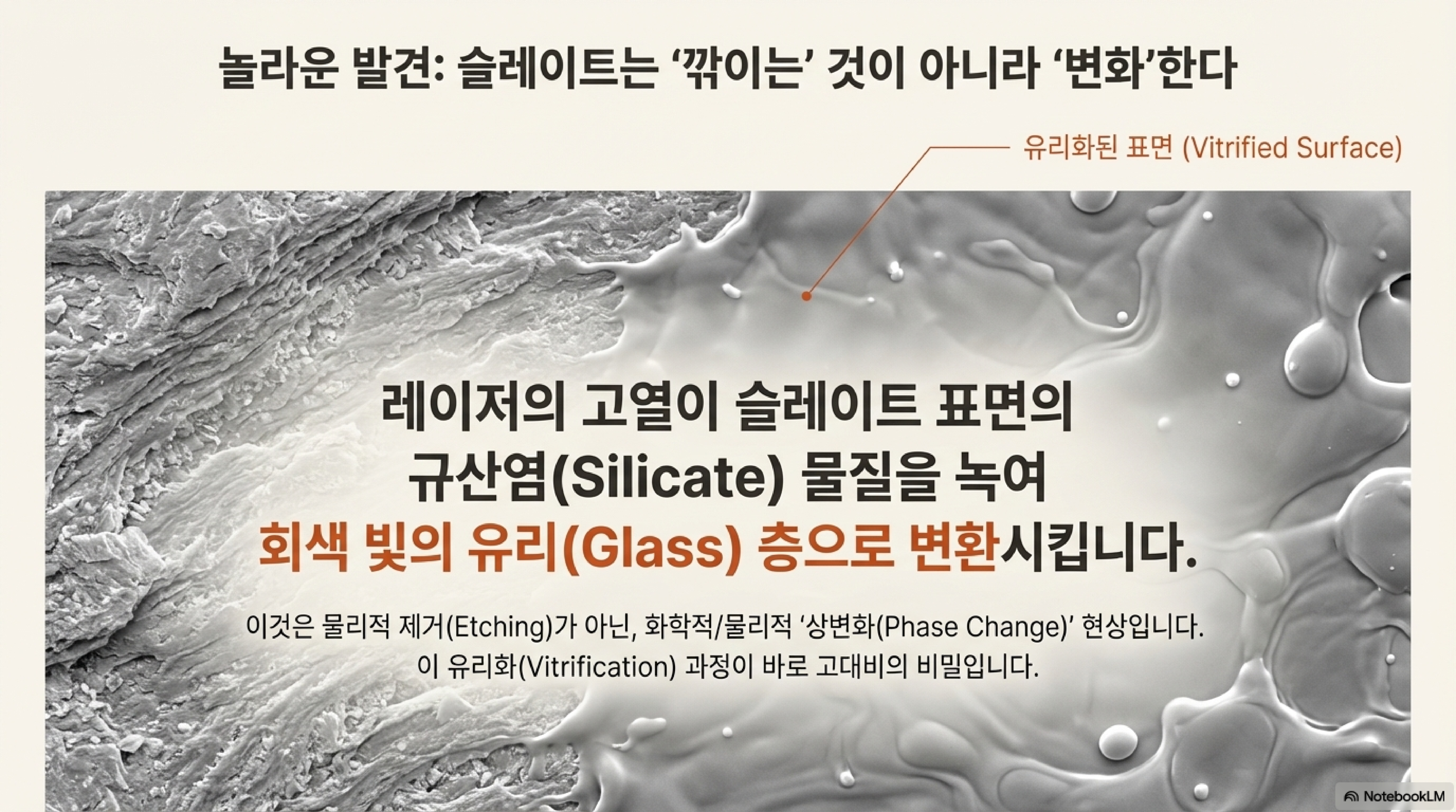 현미경이 보여준 것은 충격적인 반전이었습니다. 우리가 맨눈으로 봤던 것은 진실의 일부에 불과했습니다. 슬레이트의 회색 자국이 단순한 흠집이라고 생각했지만, 사실 그것은 매끄럽게 녹아 생성된 유리 표면이었습니다. 화강암의 거친 질감은 녹아내린 유리 방울들이 지저분하게 뭉쳐진 결과물이었죠. 맨눈으로 보는 표면적인 관찰은 때때로 우리를 속일 수 있습니다. 이처럼 깊이 있는 기술적 분석이야말로 어떤 공정의 본질을 진정으로 이해하는 데 필수적이라는 사실을 다시 한번 깨닫게 되었습니다.
