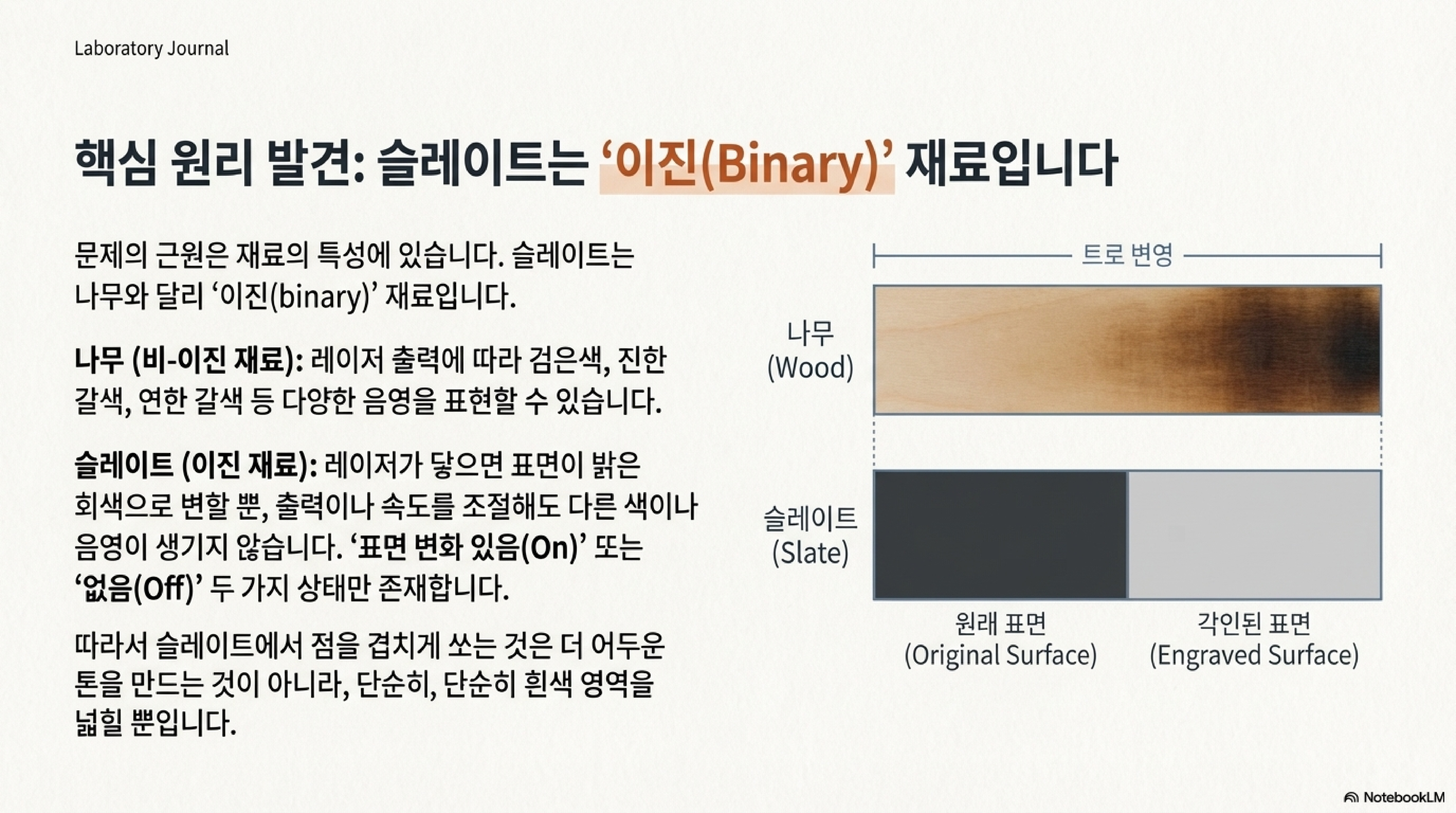 슬레이트의 특성을 이해하는 것이 핵심입니다. 저는 이것을 '바이너리(binary) 재료'라고 부릅니다. 이 개념은 제가 예전에 아노다이징 알루미늄을 다루던 실험에서 얻은 깨달음을 적용한 것입니다. 바이너리 재료란 레이저 조각 시 단 두 가지 톤, 즉 밝은 회색(마킹된 부분)과 검은색(원래 표면)만을 표현하며 그 중간 톤은 없다는 의미입니다.