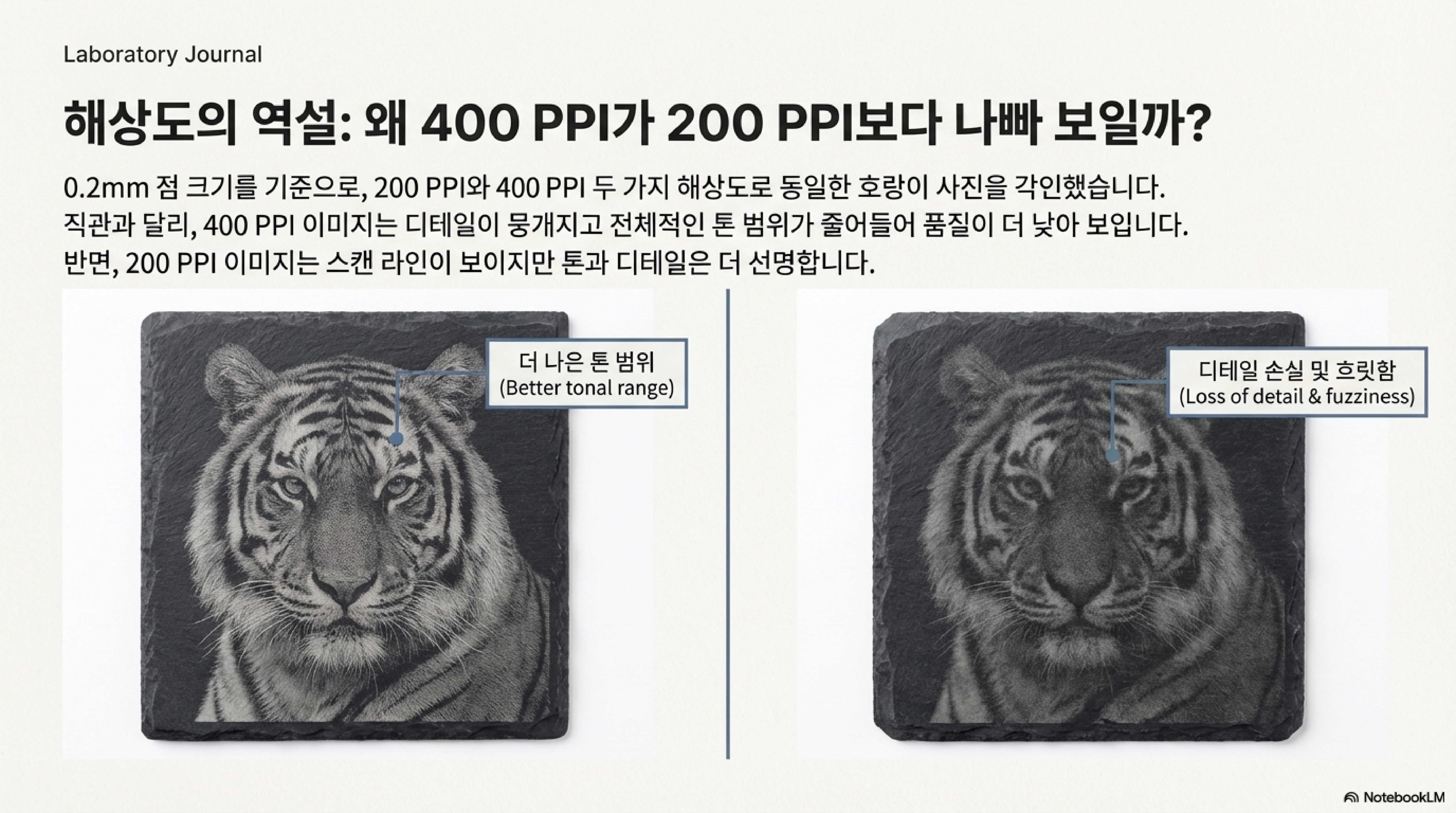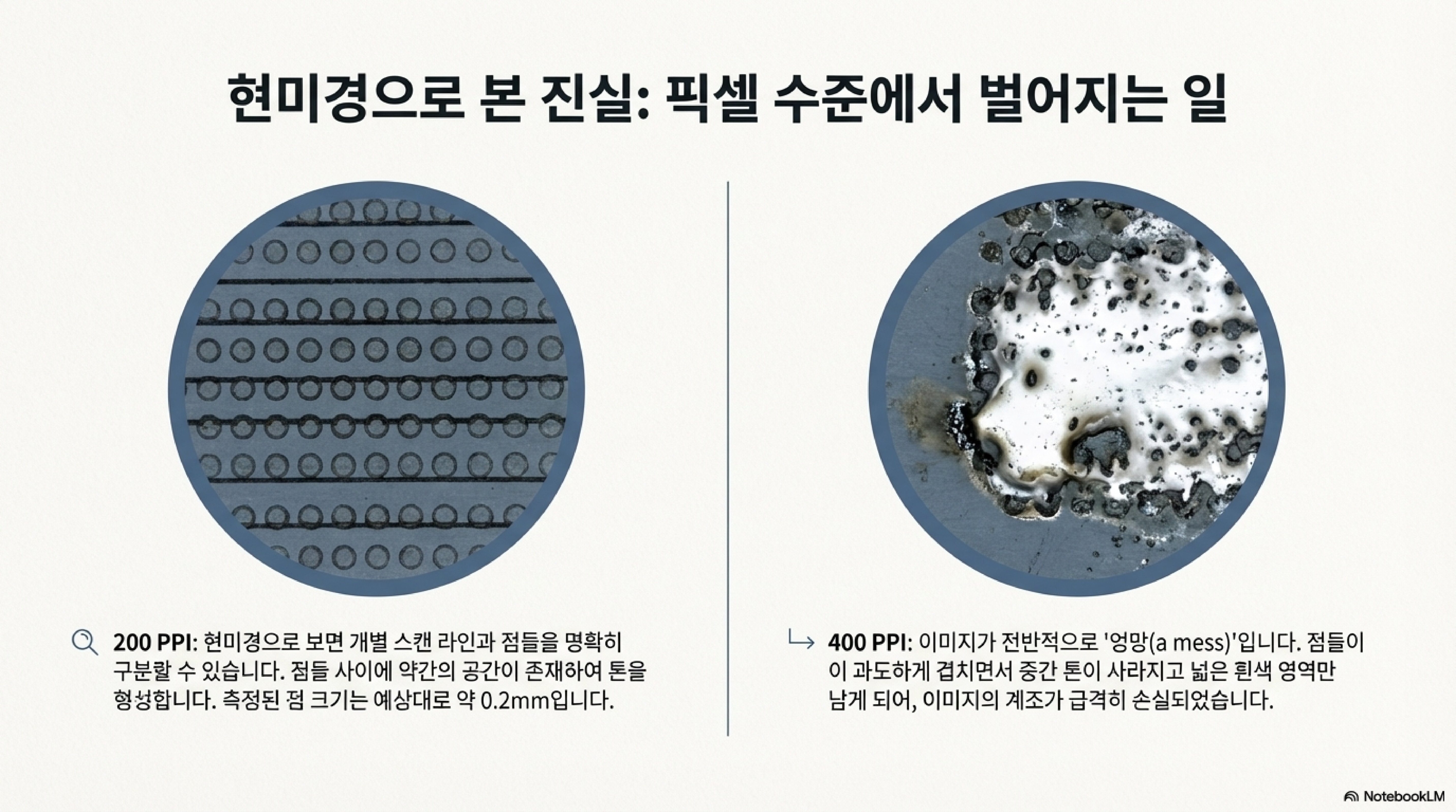 처음에는 당연히 해상도가 높을수록 더 선명한 이미지가 나올 것이라 생각했습니다. 그래서 인치당 400픽셀(PPI)로 테스트를 시작했죠. 하지만 결과는 실망스러웠습니다. 현미경으로 자세히 들여다본 이미지는 솔직히 말해 "약간 엉망진창"이었습니다. 대부분의 영역이 허옇게 날아가 버렸고, 이미지의 섬세한 톤 변화, 즉 "계조"가 거의 표현되지 않았습니다.