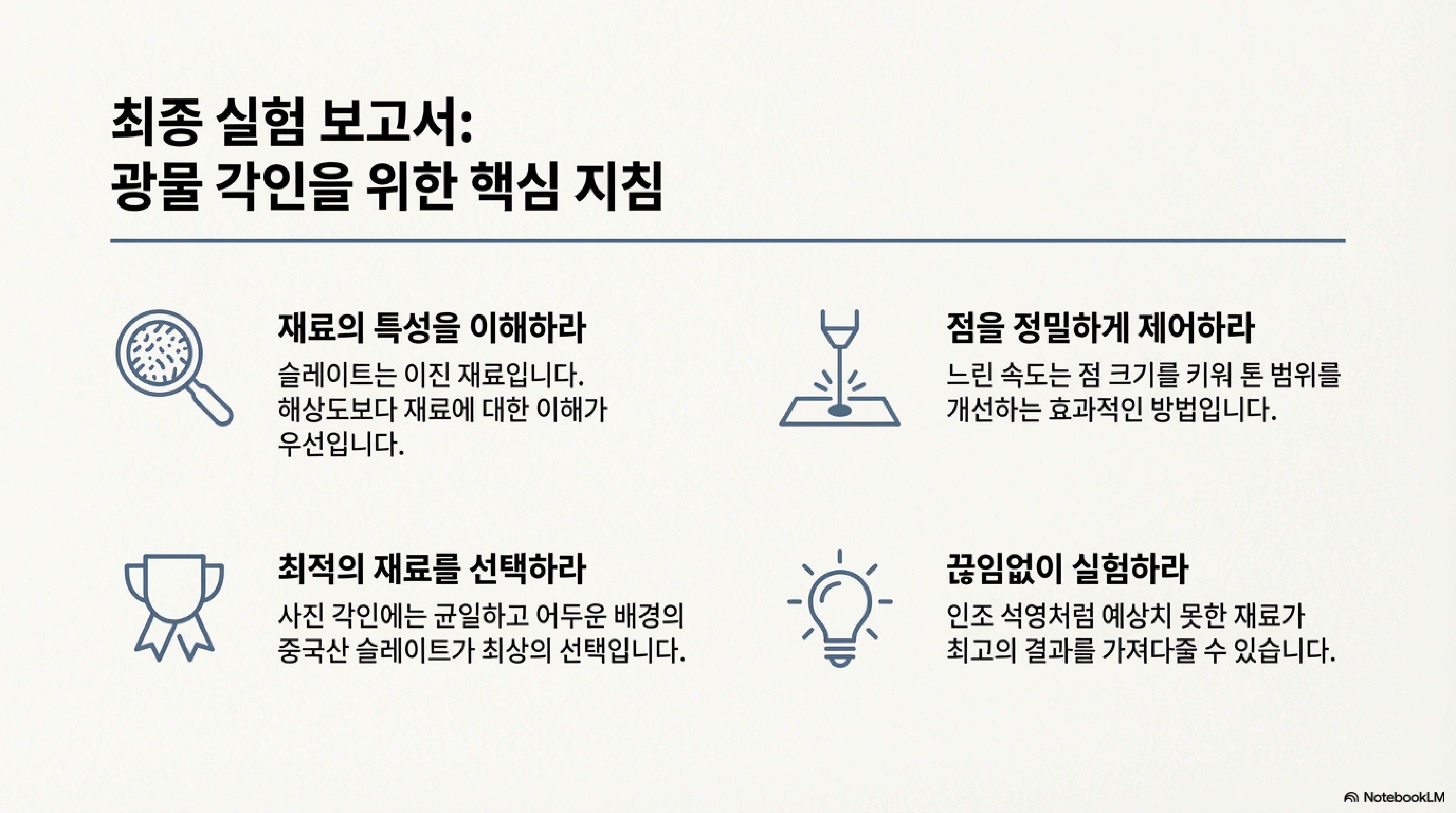 이번 글에서는 제가 직접 광물 재료에 사진을 조각하는 심층 실험을 통해 얻은, 가장 놀랍고 직관에 반하는 5가지 교훈을 공유하고자 합니다. 이것은 단순한 결과 보고가 아니라, 가설을 세우고, 테스트하고, 현미경으로 분석하며 한 걸음씩 나아간 발견의 여정입니다.