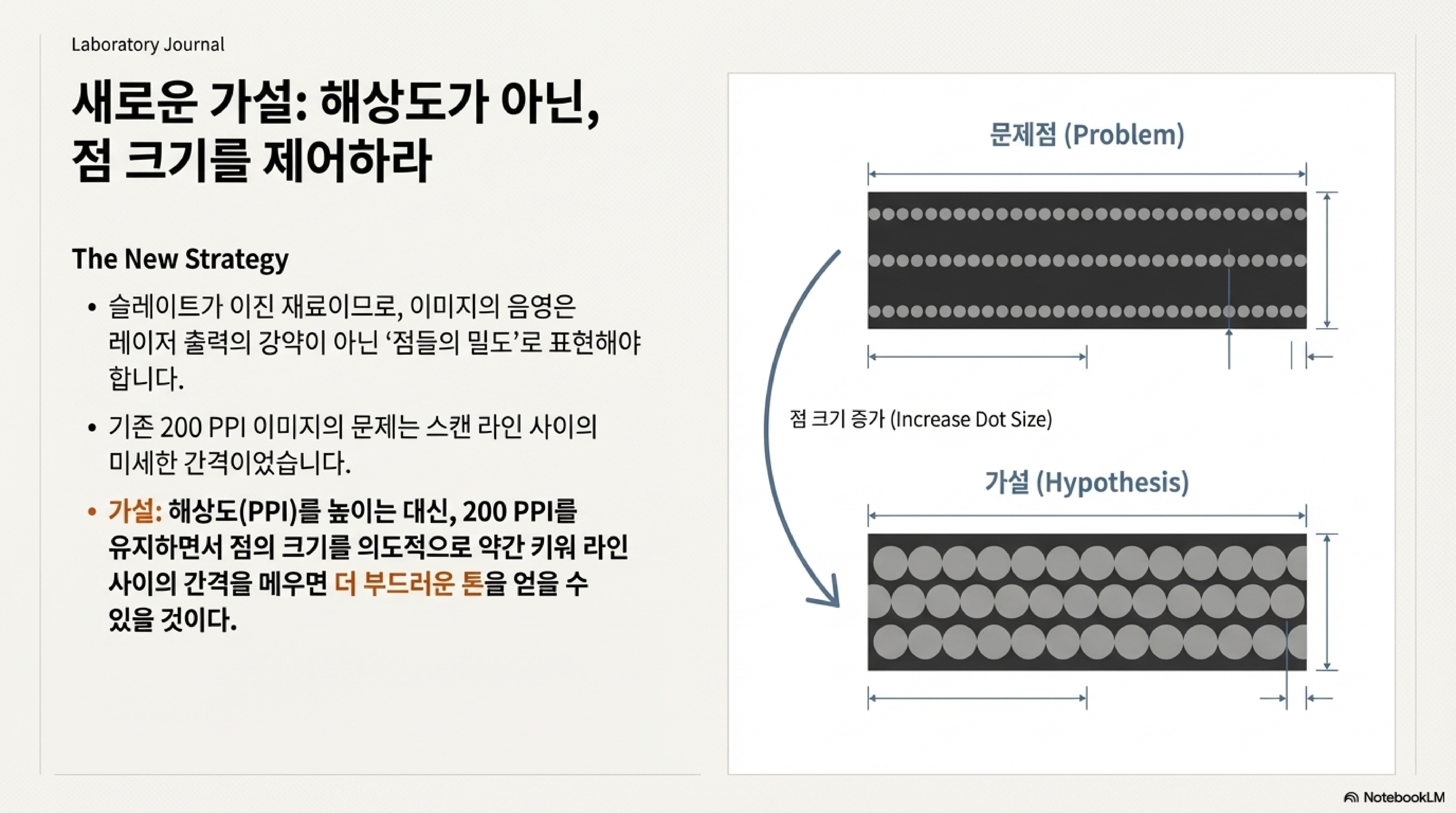 200PPI 이미지에서 저는 스캔 라인 사이에 미세한 간격이 보이는 것을 발견했습니다. 문제점은 명확했습니다. 이 간격을 메워야 더 완성도 높은 이미지를 얻을 수 있었습니다. 저의 목표는 PPI를 높이는 대신, 각 점의 크기를 키워 이 간격을 채우는 것이었습니다.
