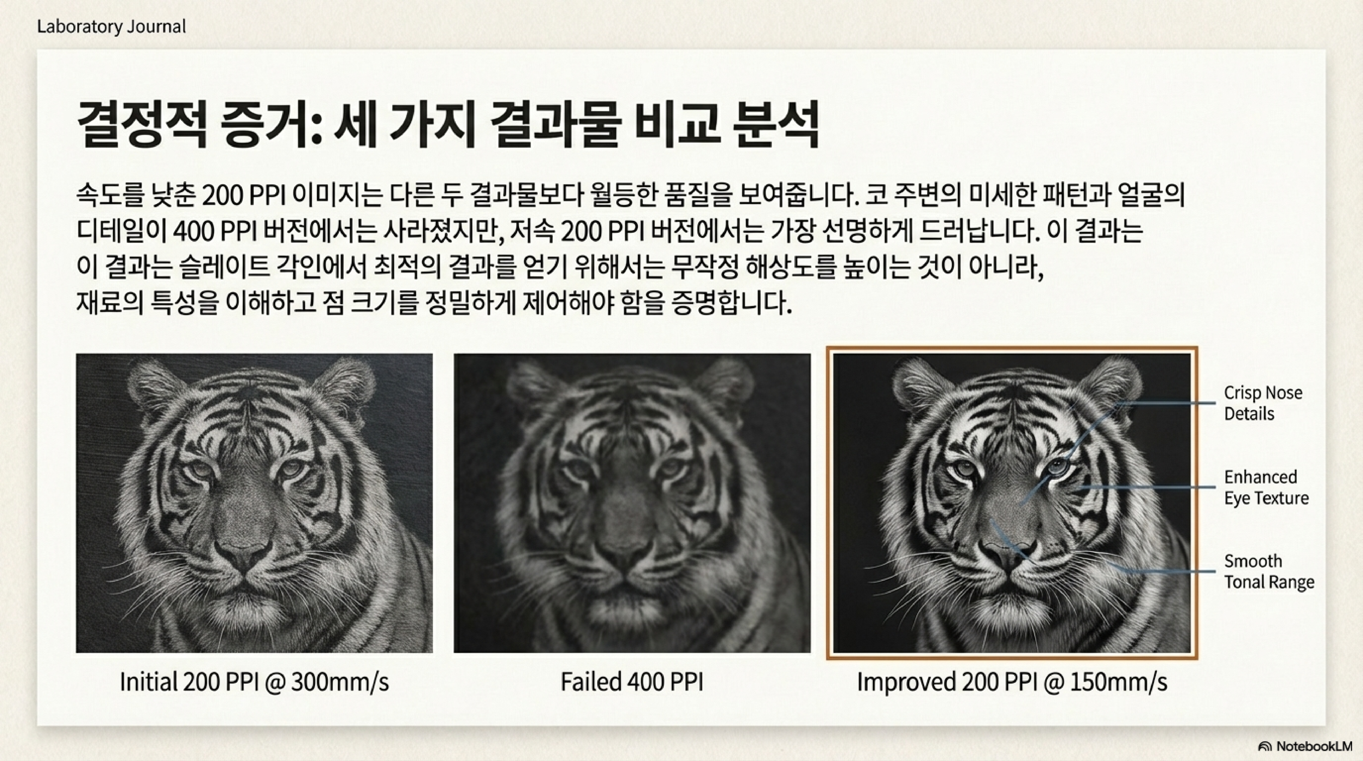 결과는 완벽했습니다. 속도를 늦추자 점의 크기가 커지면서 라인 사이의 간격이 메워졌고, 이전에는 보이지 않던 호랑이 코 위의 섬세한 무늬 같은 디테일이 선명하게 드러났습니다.