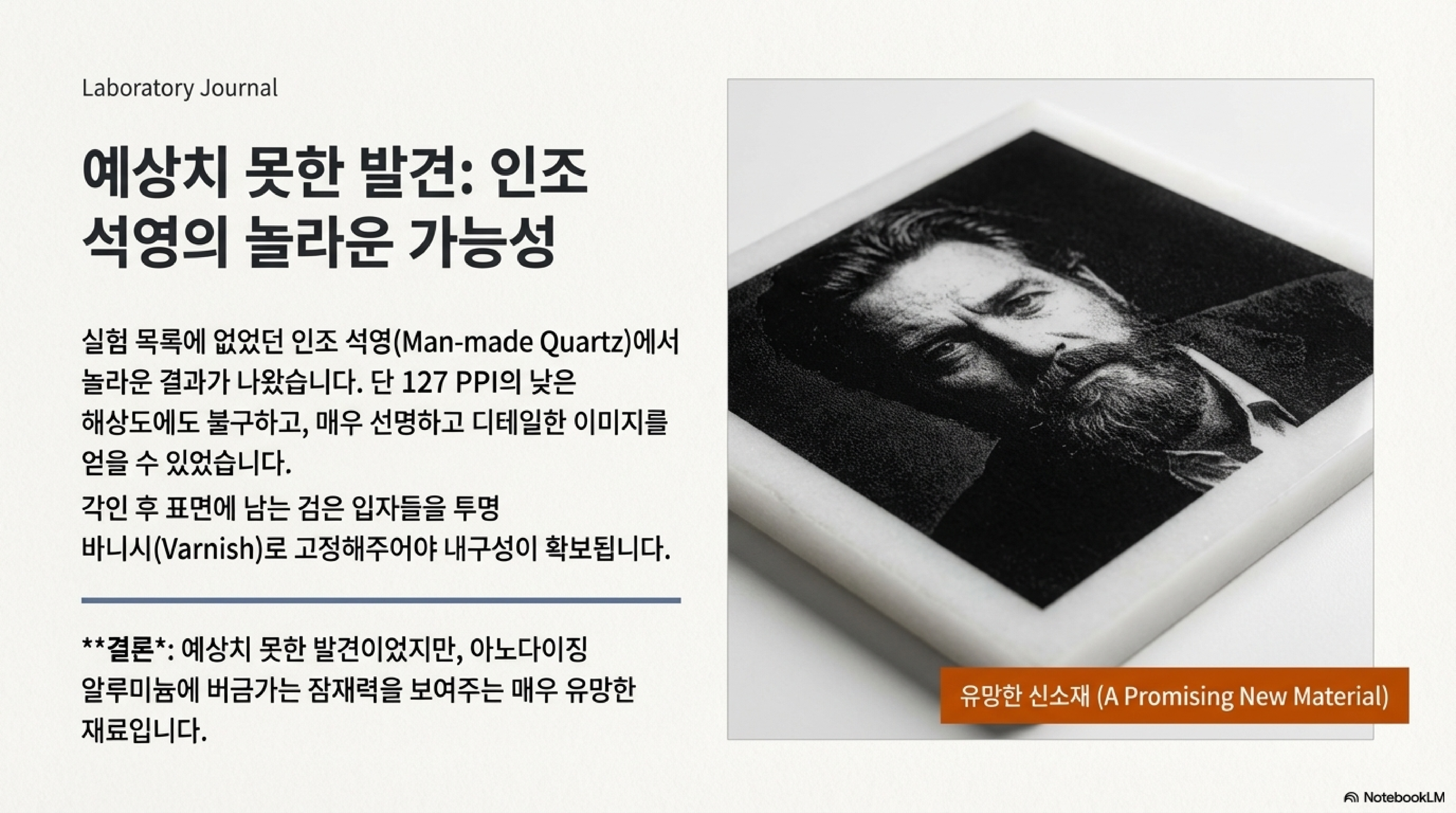 하지만 결과는 제 예상을 완전히 뒤엎었습니다. 인조 석영은 "그 자체만으로도 놀라운 이미지"를 만들어냈습니다. 물론 아노다이징 알루미늄에 새긴 초고해상도 이미지만큼은 아니었지만, 이번 실험에서 "가장 큰 놀라움"을 안겨준 발견이었습니다.