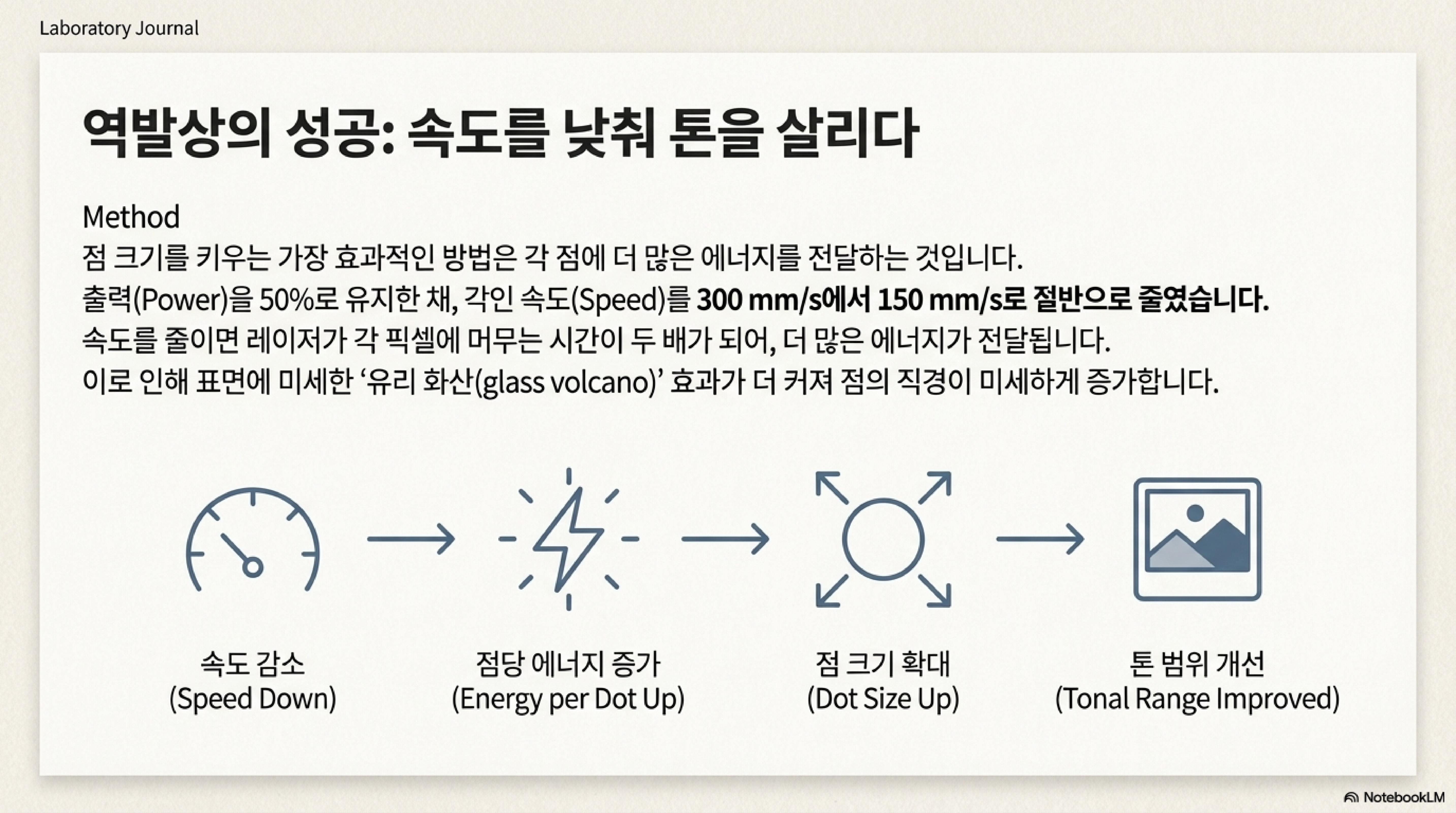 두 가지 선택지가 있었습니다. 레이저 출력을 50%에서 70%로 높이거나, 속도를 300mm/s에서 150mm/s로 줄이는 것이었죠. 저는 여기서 "다소 직관에 반하는 결정"을 내렸습니다. 바로 속도를 줄이는 것이었습니다. 왜냐하면 속도를 절반으로 줄이면 각 점에 전달되는 에너지는 정확히 두 배가 되기 때문입니다. 반면, 레이저 튜브의 비선형적인 출력 곡선 때문에 출력을 50%에서 70%로 높여도 실제 에너지 증가는 10~15%에 불과합니다.