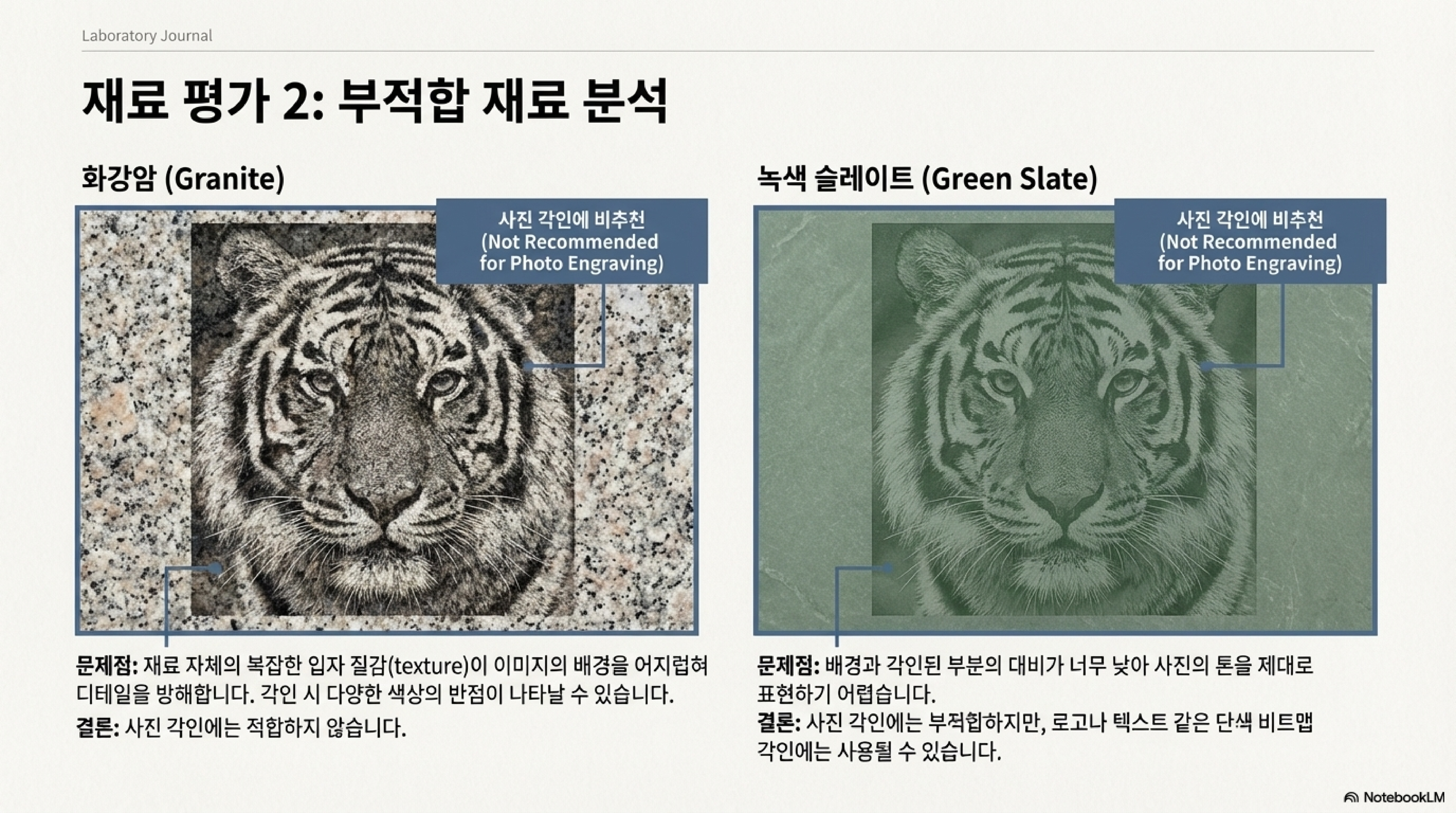 사진 조각에 적합하지 않은 다른 재료들도 테스트했습니다. 화강암은 고유의 질감이 이미지의 느낌을 해쳐 전반적인 그림을 방해했습니다. 녹색 슬레이트는 대비가 약해 사진에는 부적합했지만, 단색의 로고나 텍스트 같은 '블록 조각'에는 유용할 수 있다는 점을 발견했습니다.