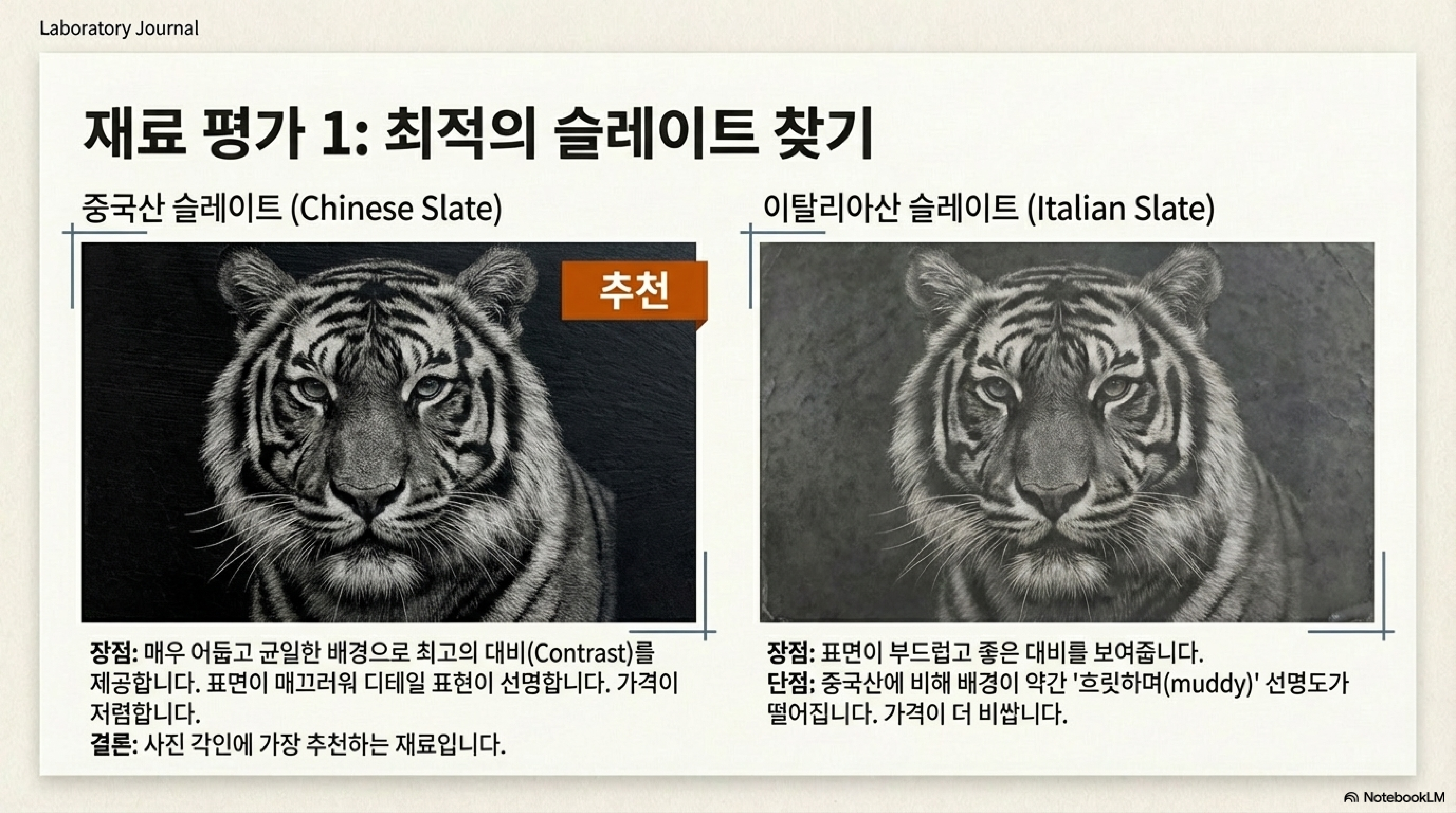 이번 실험에서는 고가의 이탈리아산 슬레이트와 저렴한 중국산 슬레이트를 직접 비교했습니다. 이탈리아산 슬레이트는 표면이 "이상하고 탁한 느낌의 재료" 같아서 디테일이 뭉개지는 경향이 있었습니다.