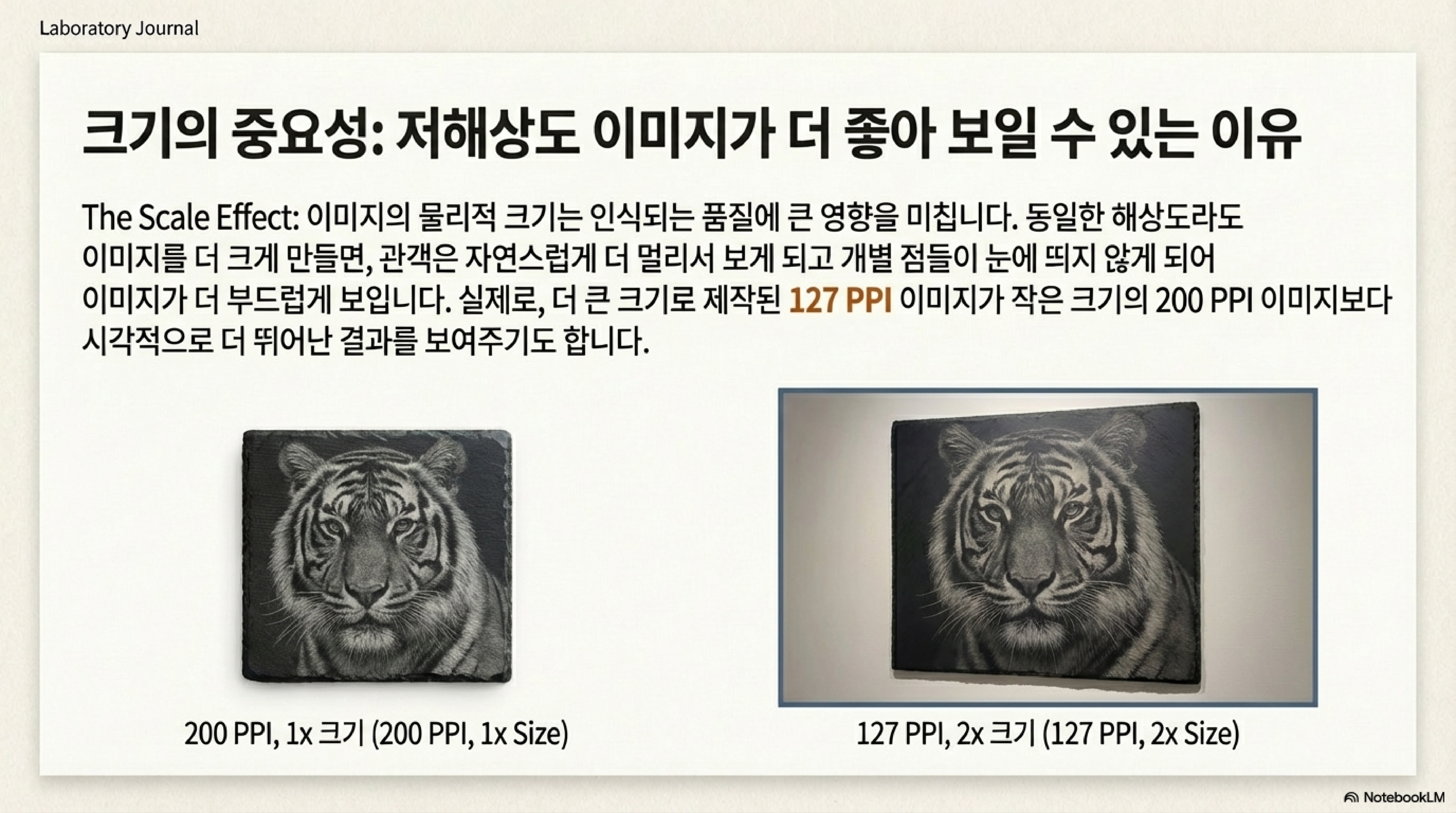 결과는 놀라웠습니다. 훨씬 더 큰 슬레이트 판에 127PPI라는 낮은 해상도로 새긴 이미지가 가장 훌륭한 결과물을 보여주었습니다. 왜 이런 현상이 발생할까요? 약 1미터 정도의 거리에서 이미지를 보면, 우리 눈은 개별 점들을 자연스럽게 혼합하여 인식합니다. 이 때문에 큰 캔버스에 새겨진 저해상도 이미지가 작은 캔버스에 빽빽하게 새겨진 고해상도 이미지보다 오히려 더 선명하고 디테일이 살아있는 것처럼 보이는 것입니다.