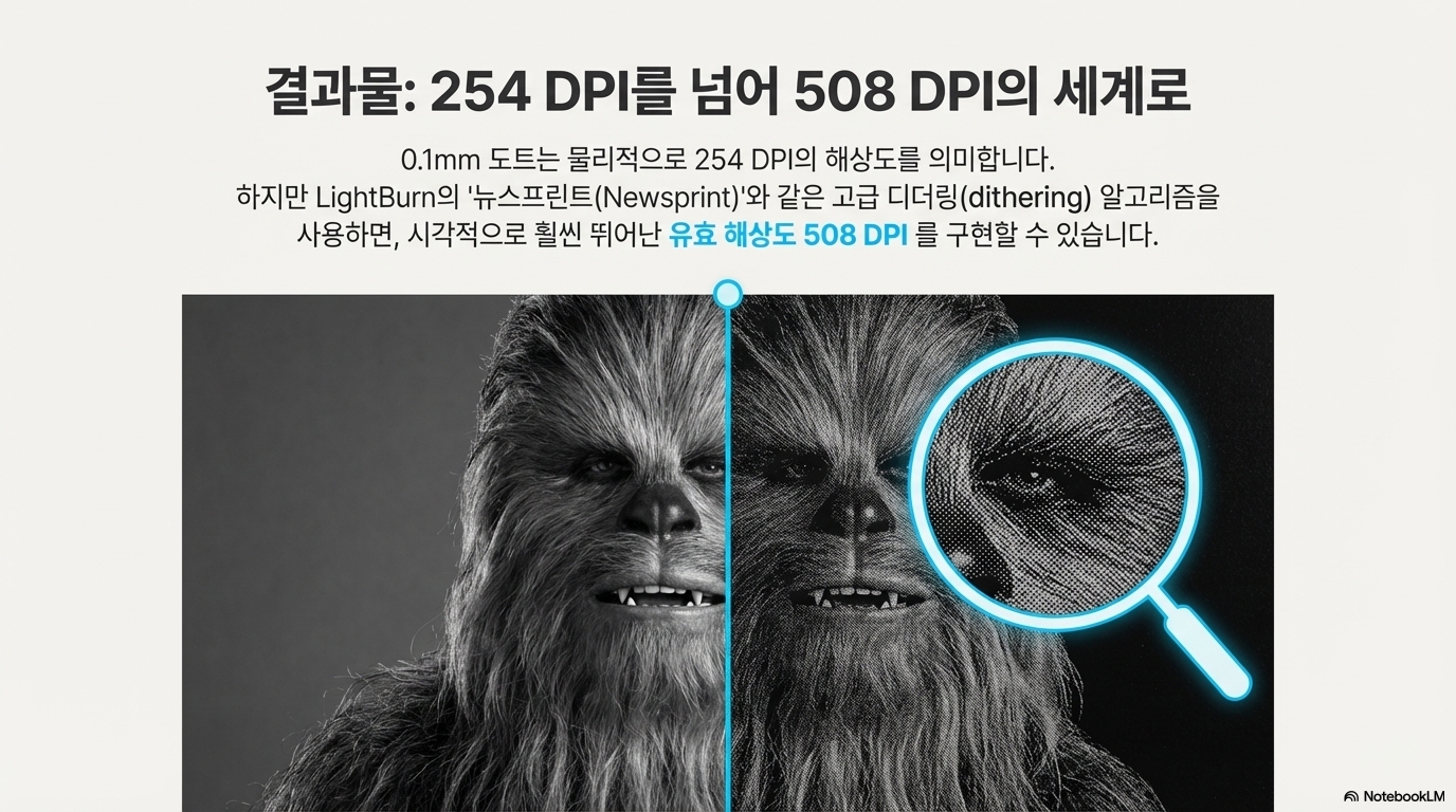 - 흥미롭게도, 이론적 한계의 두 배인 508 PPI로 각인했을 때 "경이로울" 정도로 최고의 결과물이 나왔습니다. 이는 0.1mm 점들의 정밀하게 제어된 중첩이 오히려 빈 공간을 메워 더 풍부하고 연속적인 톤을 만들어낼 수 있음을 시사합니다.