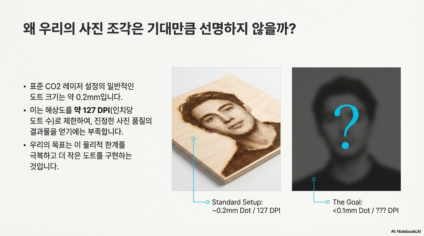레이저 각인, 특히 사진 각인을 즐기는 분들이라면 누구나 한 번쯤 벽에 부딪히는 경험이 있을 것입니다. 바로 점(dot)의 물리적 크기 때문에 진정한 고해상도 이미지를 얻기 어렵다는 한계입니다. 아무리 설정을 바꿔봐도 점이 더 작아지지 않아 디테일이 뭉개지는 좌절감을 느껴보셨을 겁니다. 이 글은 바로 그 한계를 넘어서기 위한 실험적 여정에 대한 기록입니다. '가능한 가장 작은 점'을 찾기 위한 탐구 과정에서 발견한, 때로는 직관에 반하는 놀라운 사실들을 공유하고자 합니다.