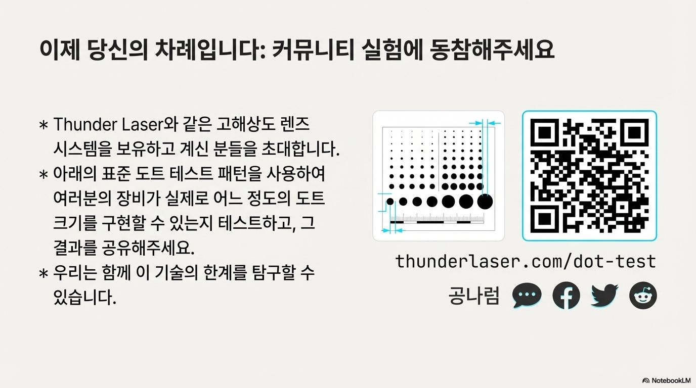 따라서 이 마지막 발견은 커뮤니티를 향한 하나의 질문이자 도전입니다. 저는 썬더 레이저(Thunder Laser)와 같은 고급 상용 렌즈를 소유한 분들이 제 테스트 패턴을 실행하여, 마케팅 자료에서 주장하는 0.025mm와 같은 초소형 점을 실제로 구현할 수 있는지 확인해주기를 바랍니다.