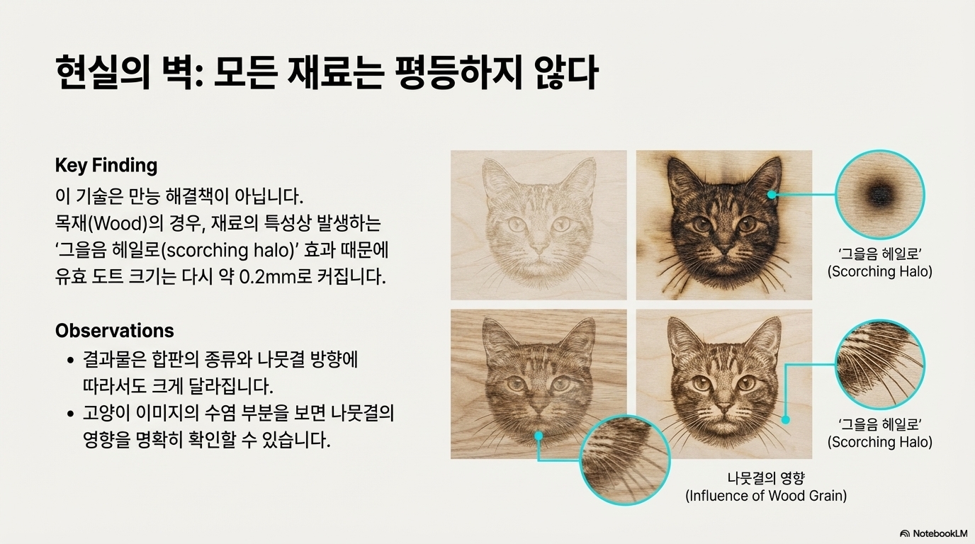 고해상도 각인의 첫 번째 비밀은 기계 설정이 아닌 재료 자체에 있었습니다. 나무와 같은 유기 재료를 각인할 때 우리는 '그을음 헤일로(scorch halo)'라는 현상과 마주하게 됩니다. 레이저가 만든 실제 구멍이 아니라 그 주변에 번지는 갈색 그을음이 눈에 보이는 점이 되는 것입니다. 이 헤일로 때문에 실질적인 점 크기는 보통 0.2mm에 머물게 되며, 이는 해상도를 127 PPI(인치당 픽셀)로 제한하는 결정적 요인이 됩니다.