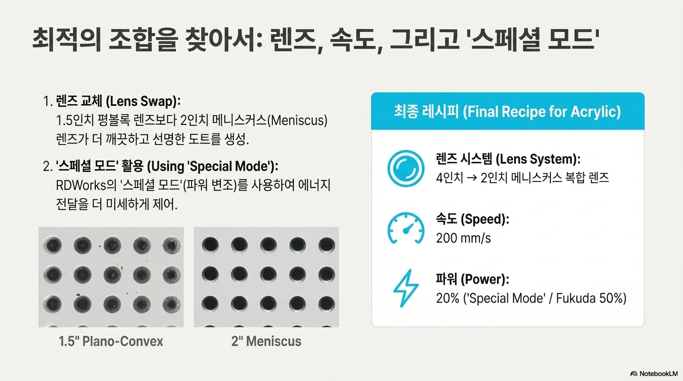 반면, 아크릴이나 아노다이징 알루미늄처럼 타지 않는 재료는 완전히 다른 가능성을 보여줍니다. 아크릴은 타는 대신 증발하고, 아노다이징 알루미늄은 표면의 염료만 증발시킵니다. 그을음 헤일로가 생기지 않기 때문에 훨씬 더 작고 깨끗한 점을 만들 잠재력이 있는 것입니다. 이것은 고해상도 작업을 위한 우리의 관점을 기계에서 레이저와 재료 간의 근본적인 상호작용으로 전환시키는 매우 중요한 발견이었습니다.
