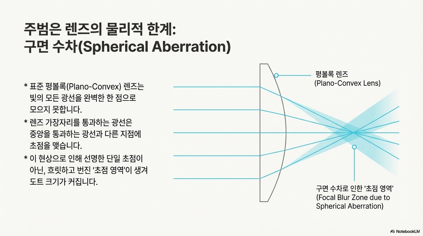 고가의 상용 시스템들은 믿을 수 없을 만큼 작은 점을 만들어낸다고 주장하는데, 저는 그들이 단순히 표준 렌즈만 사용하지는 않을 것이라고 의심했습니다. 제 가설은 그들이 '구면 수차'를 보정하는 특별한 방법을 사용한다는 것이었고, 이 가설을 검증하기 위해 직접 '복합 렌즈(compound lens)' 시스템을 개발하기에 이르렀습니다.