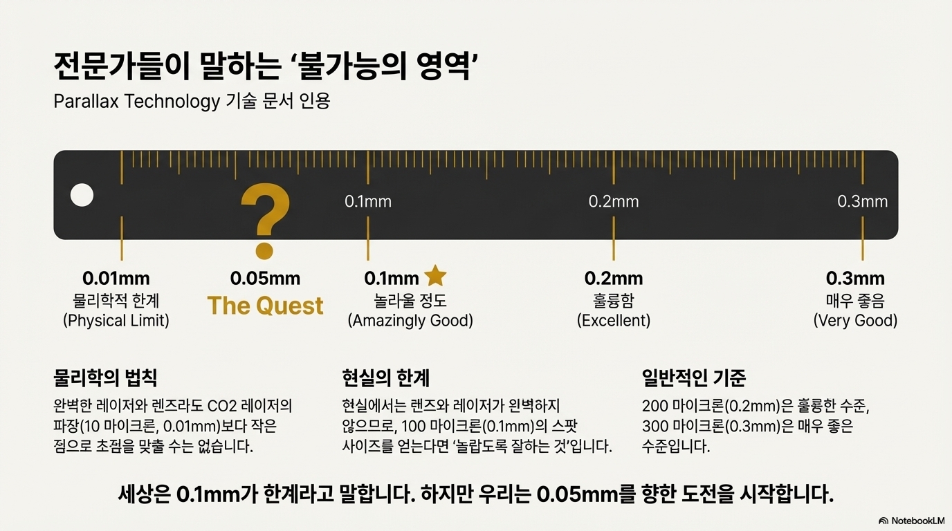 CO2 레이저 기술에 대한 Parallax Technology의 기술 문서는 물리학적 한계를 명확히 설명합니다. 레이저 빛의 파장 때문에 0.1mm(100마이크론) 크기의 점을 얻는 것만으로도 "놀랍도록 좋은(amazingly good)" 결과로 여겨진다고 말합니다. 대부분의 사람들은 이 지점에서 만족하고 멈췄을 것입니다.