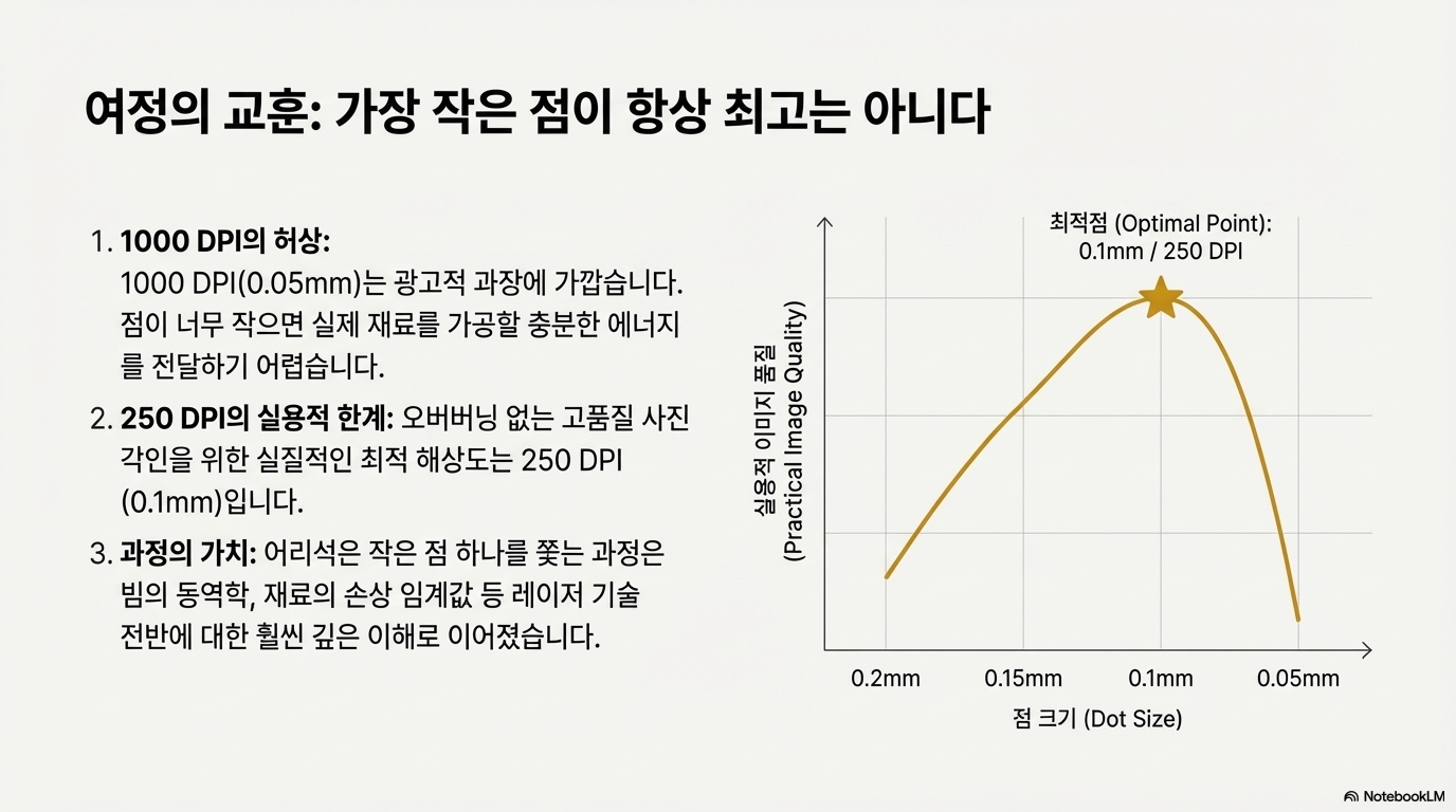이 모든 실험을 통해 얻은 가장 실용적인 결론은 무엇일까요? 바로 고품질 사진 각인의 현실적인 한계입니다. 실험을 통해 찾아낸 최적의 점 크기인 0.1mm는 인치당 도트 수(DPI)로 환산하면 약 254 DPI에 해당합니다. 이것이 바로 재료를 손상시키지 않으면서 최고 품질의 결과를 얻을 수 있는 현실적인 해상도의 한계였습니다.