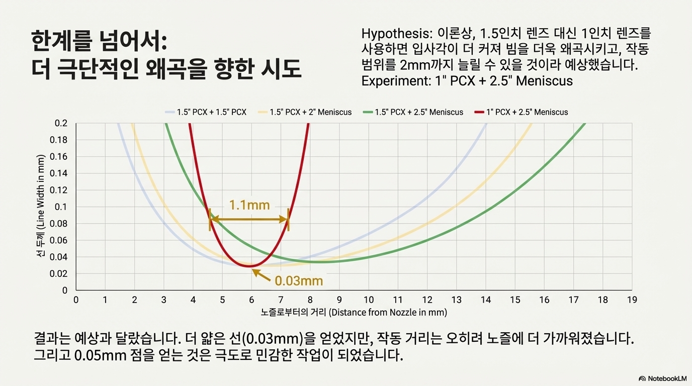 그것은 바로 두 렌즈의 조립 방식을 바꾸는 것이었습니다. 이전까지 렌즈와 렌즈 사이에 고무 O링 스페이서를 끼워 간격을 두었던 것을, 그 스페이서를 제거하고 두 렌즈를 "서로 바짝 붙이는 것"으로 바꾸었습니다. 이 미세한 물리적 변화가 빔의 특성을 극적으로 안정시켜, 이상적인 0.1mm 점을 탄생시켰습니다.