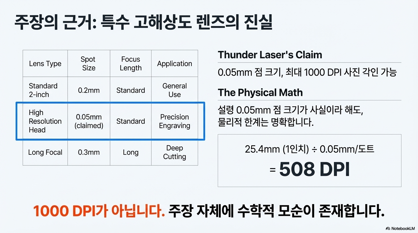 분석가가 썬더 레이저의 자체 데이터를 검토하면서 조사는 결정적인 전환점을 맞이했습니다. 1000 DPI 주장의 허점은 다름 아닌 그들이 스스로 공개한 정보에서 명확히 드러났기 때문입니다. 썬더 레이저 웹사이트에 게시된 렌즈 사양을 확인한 결과는 충격적이었습니다.