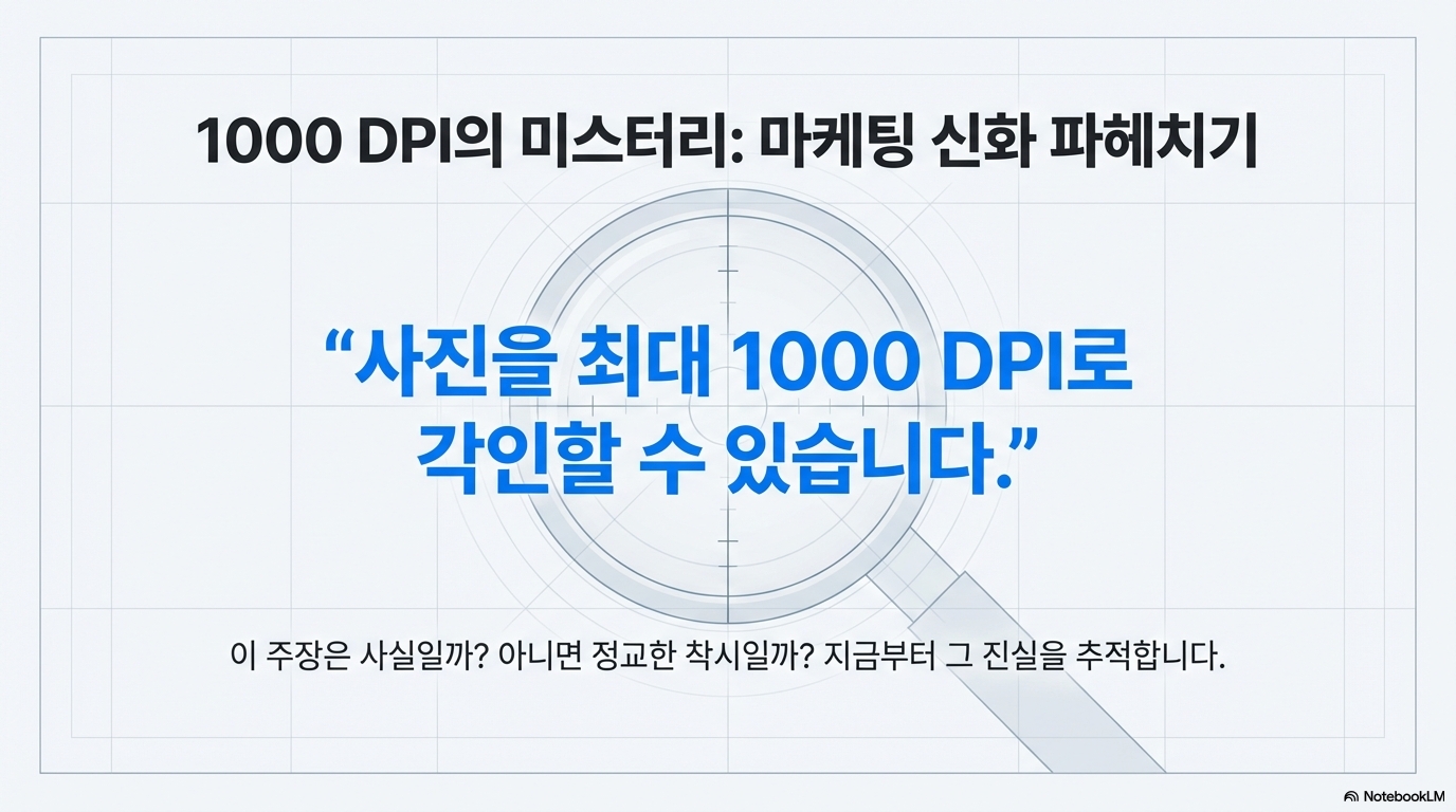 그들이 자랑하는 특수 "고해상도 헤드"조차도 만들 수 있는 점의 크기가 0.05mm라고 명시되어 있습니다. 여기서 다시 간단한 계산을 해볼 수 있습니다. 0.05mm 크기의 점들을 빈틈없이 나란히 배열할 경우, 1인치 안에 들어갈 수 있는 점의 최대 개수는 몇 개일까요? (1인치, 즉 25.4mm를 0.05mm로 나누면 508, 즉 약 500 DPI가 됩니다.) 그렇습니다. 그들 최고의 기술로도 물리적 최대 해상도는 1000 DPI가 아닌 500 DPI인 것입니다.