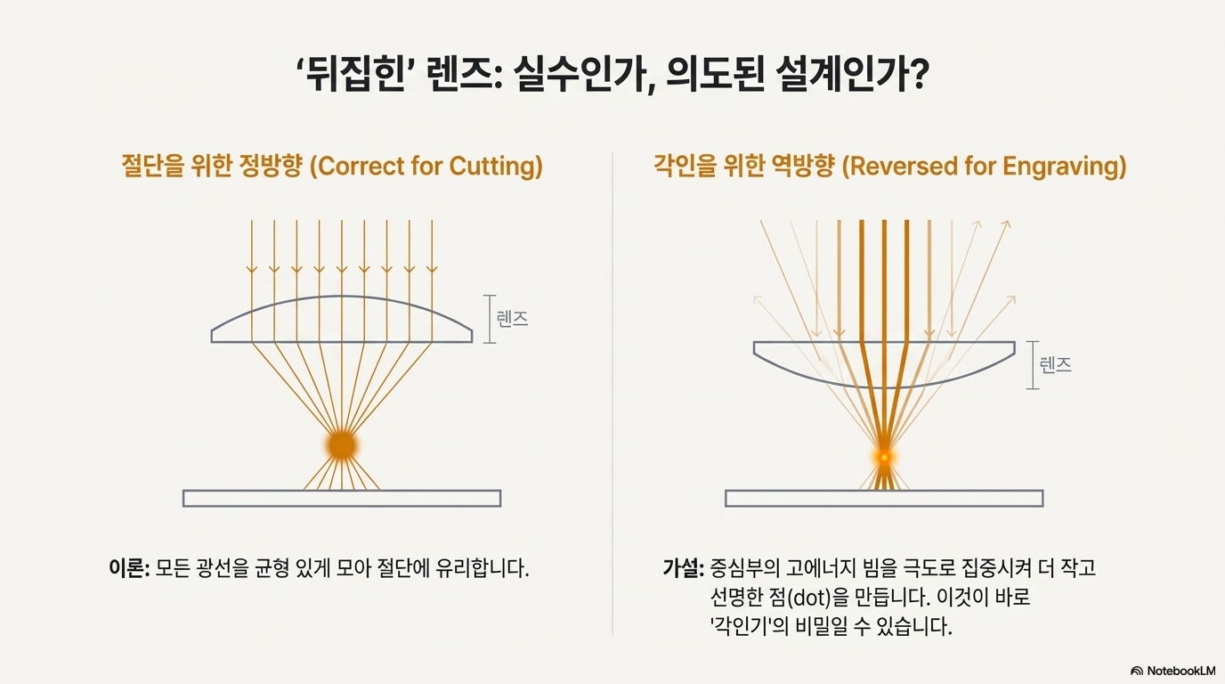 많은 중국 제조사들은 기계를 출고할 때 렌즈를 "거꾸로"(볼록한 면이 아래로 향하게) 장착하는데, 이 방향이 실제로는 더 작고 집중된 점(dot)을 만들어내어 정밀 조각 작업에 더 우수하다는 사실이 밝혀졌습니다. 그 이유는 이 방향이 빔의 에너지 프로파일을 의도적으로 조작하기 때문입니다. 볼록한 면을 아래로 향하게 하면 에너지가 약한 빔의 바깥쪽 광선은 걸러내고, 에너지가 밀집된 중심부 광선만 정확하게 한 점에 모을 수 있습니다. 이것이 바로 더 깨끗하고 정밀한 조각을 가능하게 하는 비결입니다. 참고로 렌즈를 뒤집으면 초점 거리가 최대 2mm까지 달라질 수 있으므로 재조정이 필수적입니다.
