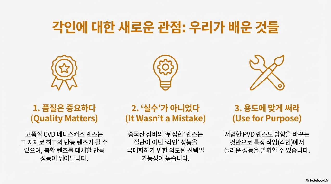 렌즈를 '거꾸로' 뒤집어 조각 품질을 높이는 것부터, 절단면 기울기의 진짜 원인을 기계 설계의 한계로 재정의하는 것까지, 우리는 오늘 상식을 의심하는 것이 얼마나 중요한지 확인했습니다. 레이저 렌즈의 세계는 겉으로 보이는 것보다 훨씬 더 복잡하고 놀라운 사실들로 가득 차 있으며, 우리가 당연하게 여겼던 지식에 도전하는 것이 때로는 더 나은 성능과 안전한 작업을 위한 지름길이 될 수 있습니다.