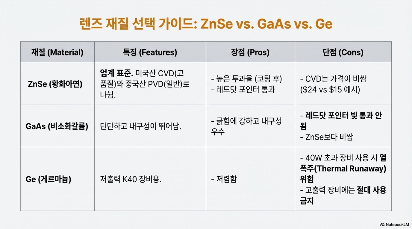 렌즈 시장에는 게르마늄(Ge)으로 만들어진 옵션도 존재합니다. 하지만 이 렌즈는 치명적이고 위험한 결함을 가지고 있습니다. 게르마늄은 상온에서는 적외선 빛을 투과시키지만, 온도가 약 100°C에 도달하면 재료가 갑자기 '흐릿해지며' 적외선에 불투명해지는 특성이 있습니다.