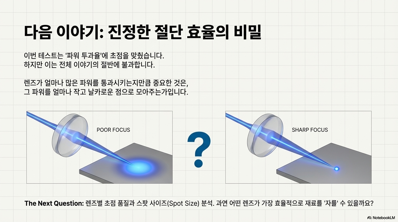 하지만 이야기는 여기서 끝나지 않습니다. 설령 렌즈가 거의 모든 출력을 통과시킨다고 해도, 그 힘을 커팅을 위해 얼마나 효율적으로 한 점에 집중시킬 수 있을까요? 출력 투과율은 렌즈 성능을 결정하는 절반의 이야기일 뿐입니다. 진정한 '최고의 렌즈'를 찾기 위한 여정은 이제 막 시작되었습니다.
