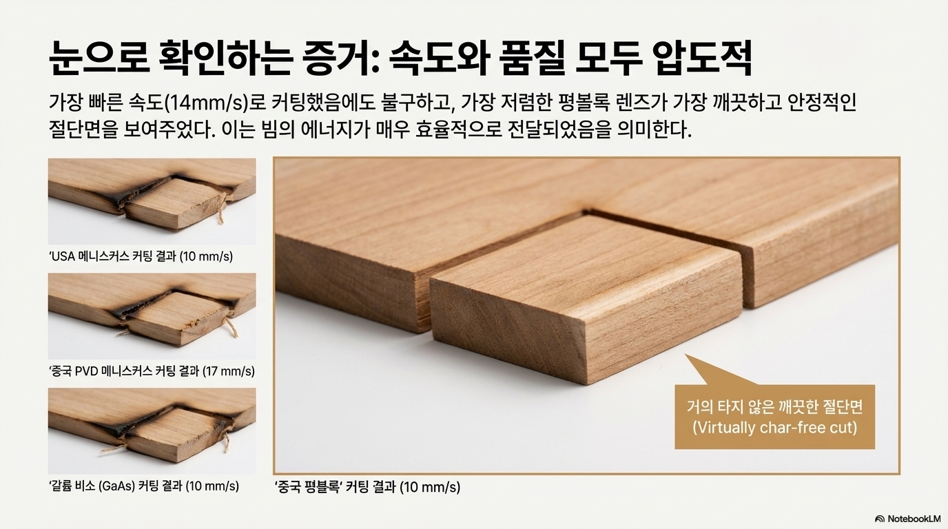 - 압도적인 승자: 가장 놀라운 결과는 테스트 렌즈 중 가장 저렴했을 것으로 추정되는 중국산 평볼록(Plano-convex) 렌즈였습니다. 이 렌즈는 무려 14mm/s의 속도에 도달하며 가장 빠르고 깨끗한 커팅 품질을 보여주었습니다.