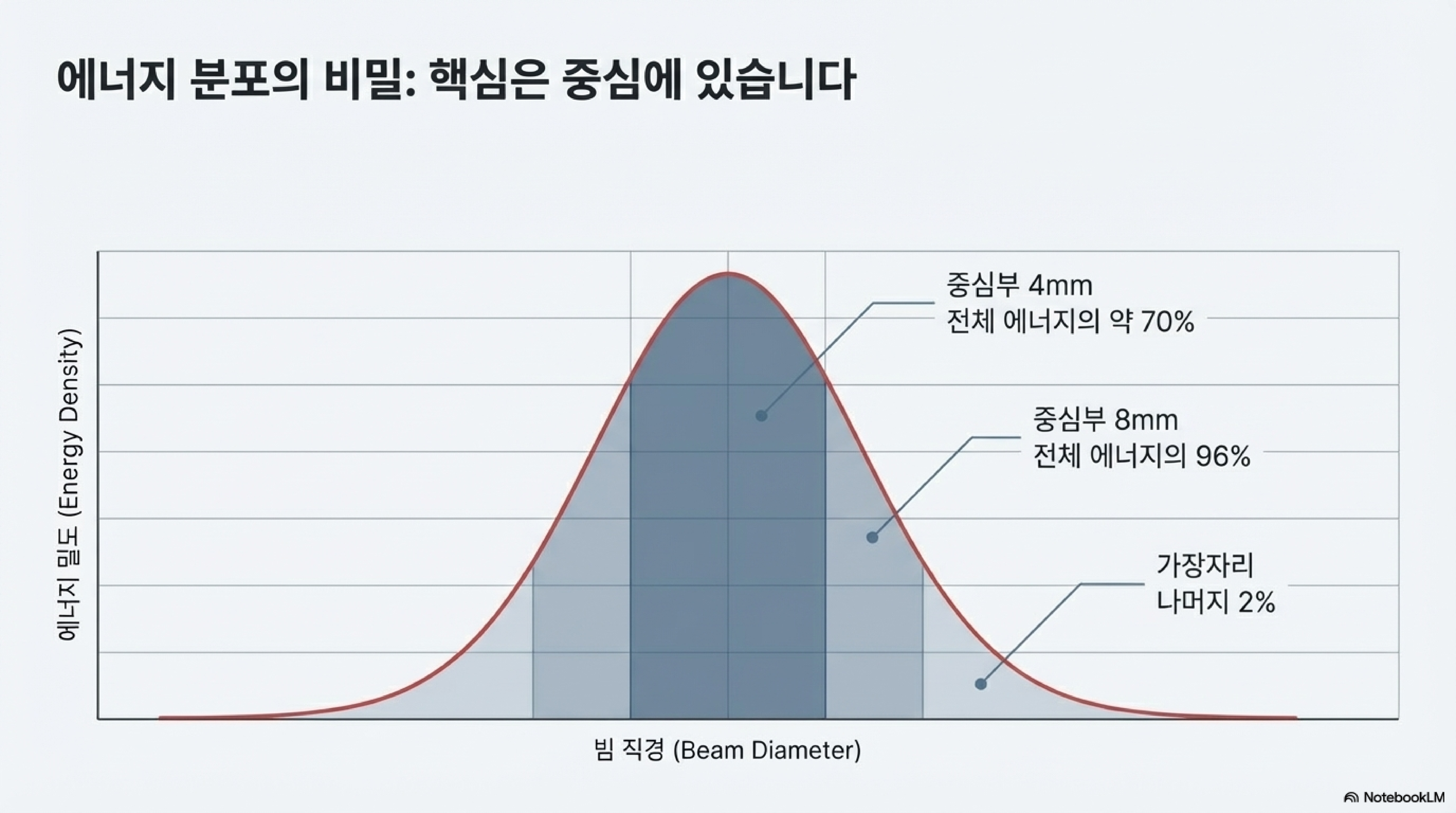 이 현상은 레이저 빔의 출력이 가우시안 분포(Gaussian distribution)를 따르기 때문에 발생합니다. 즉, 빔의 에너지는 전체 너비에 걸쳐 균일하게 퍼져 있는 것이 아니라, 중심부에 압도적으로 집중되어 있습니다. 이는 마치 물을 뿌리는 스프레이와 같습니다. 대부분의 물줄기는 중앙에 강력하게 집중되고, 가장자리로 갈수록 옅은 물안개처럼 흩어지는 것과 같은 원리입니다.