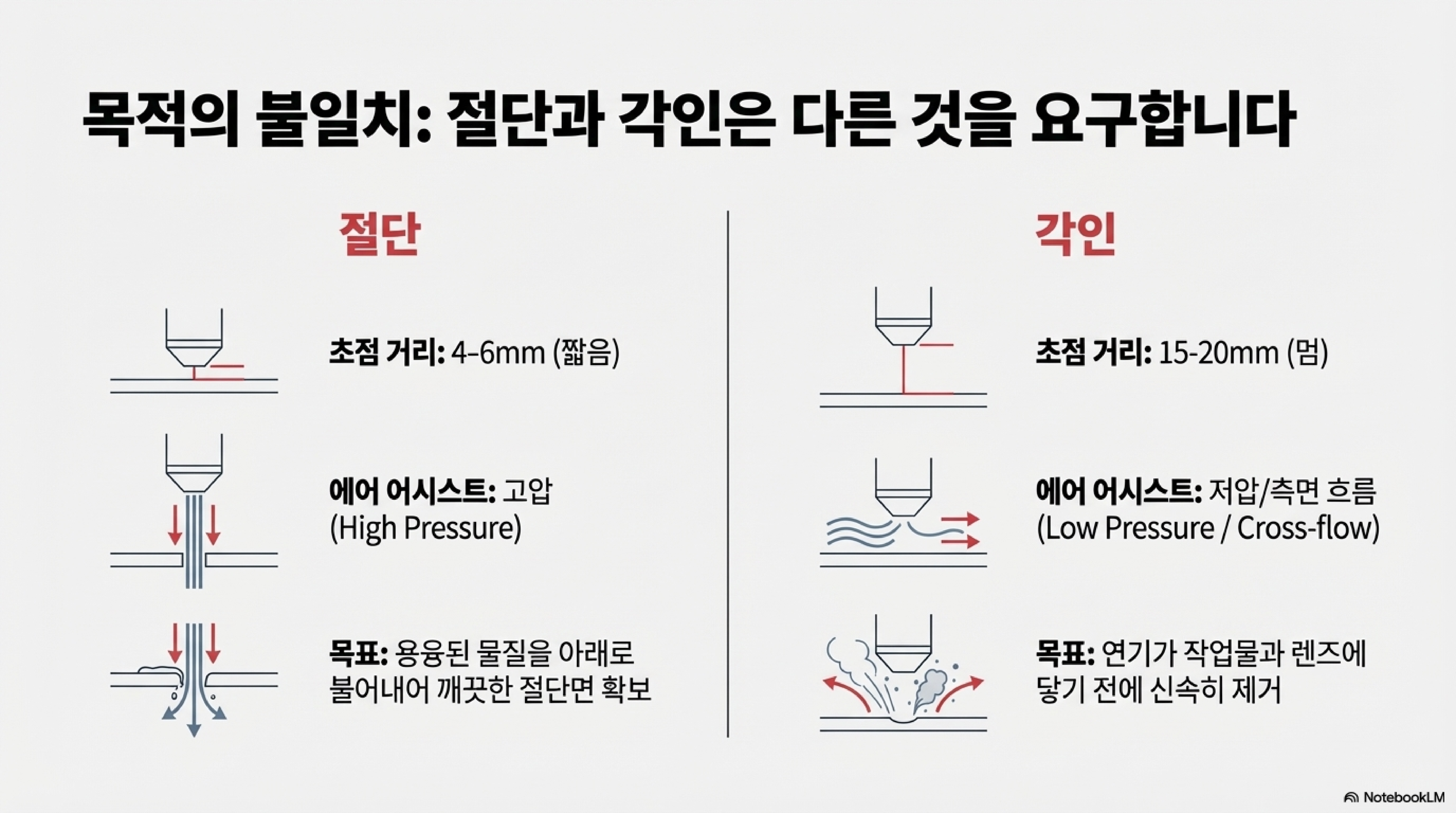 절단용 노즐을 사용해 소재 가까이에서 각인 작업을 하면, 마치 '화산 폭발'처럼 연기가 수직으로 솟구칩니다. 이 현상은 다음과 같은 두 가지 주요 문제를 일으킵니다.
