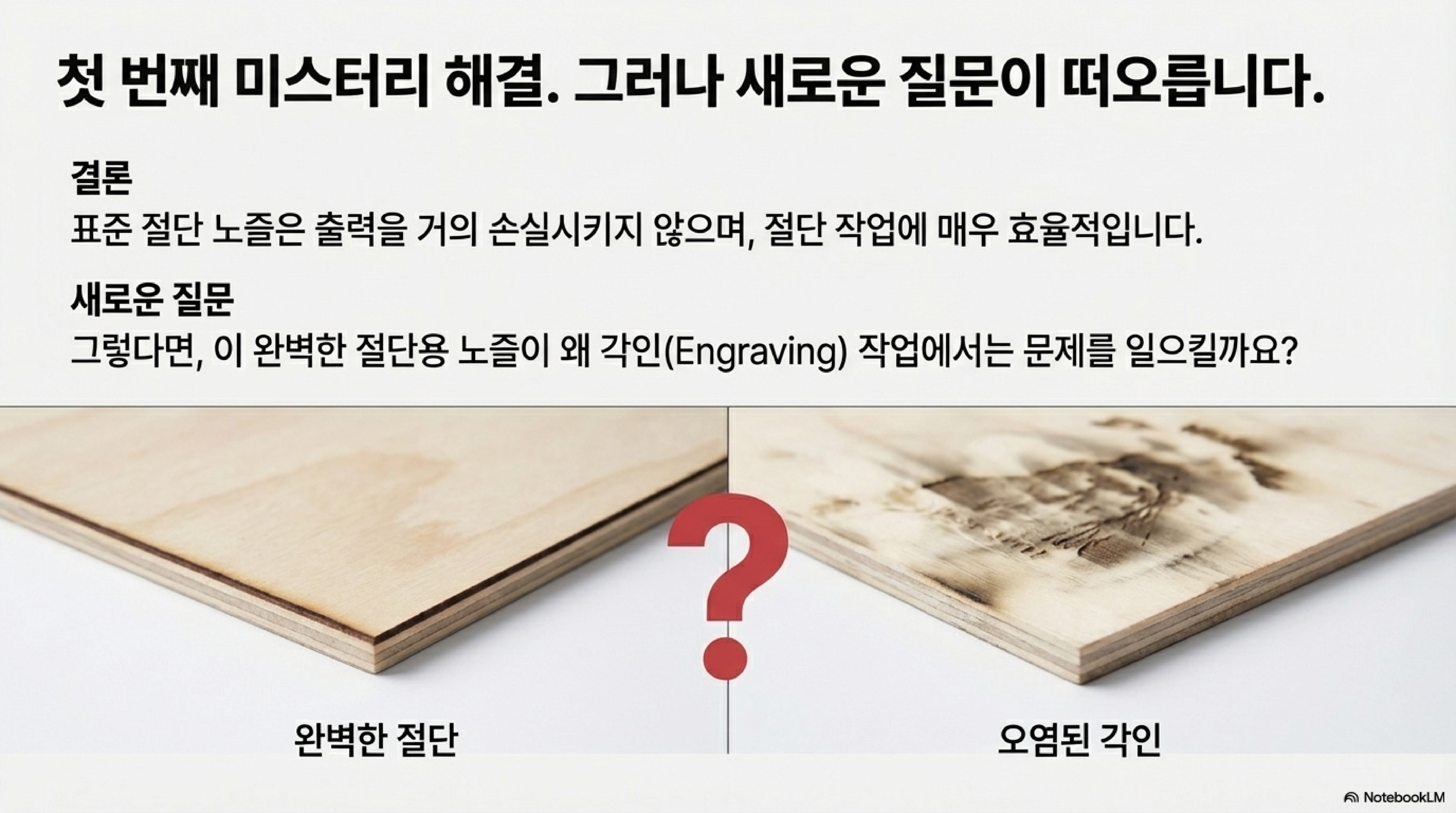 각인 품질이 떨어지는 문제가 레이저 출력이나 속도 설정 때문이 아니라, 작업에 맞지 않는 노즐을 사용하여 연기를 제대로 관리하지 못했기 때문일 수 있다는 것. 이것이 바로 우리가 바꿔야 할 패러다임입니다.