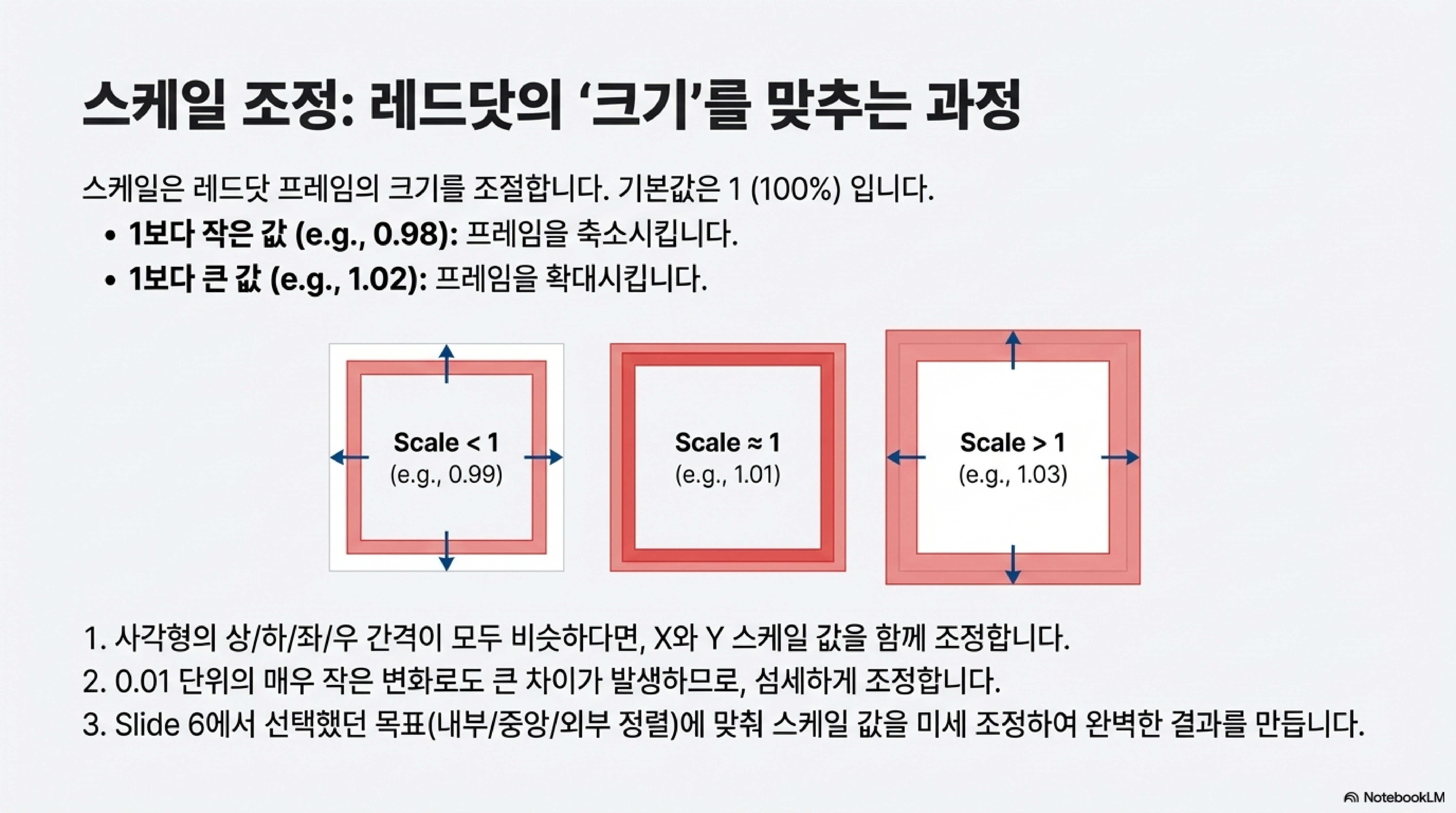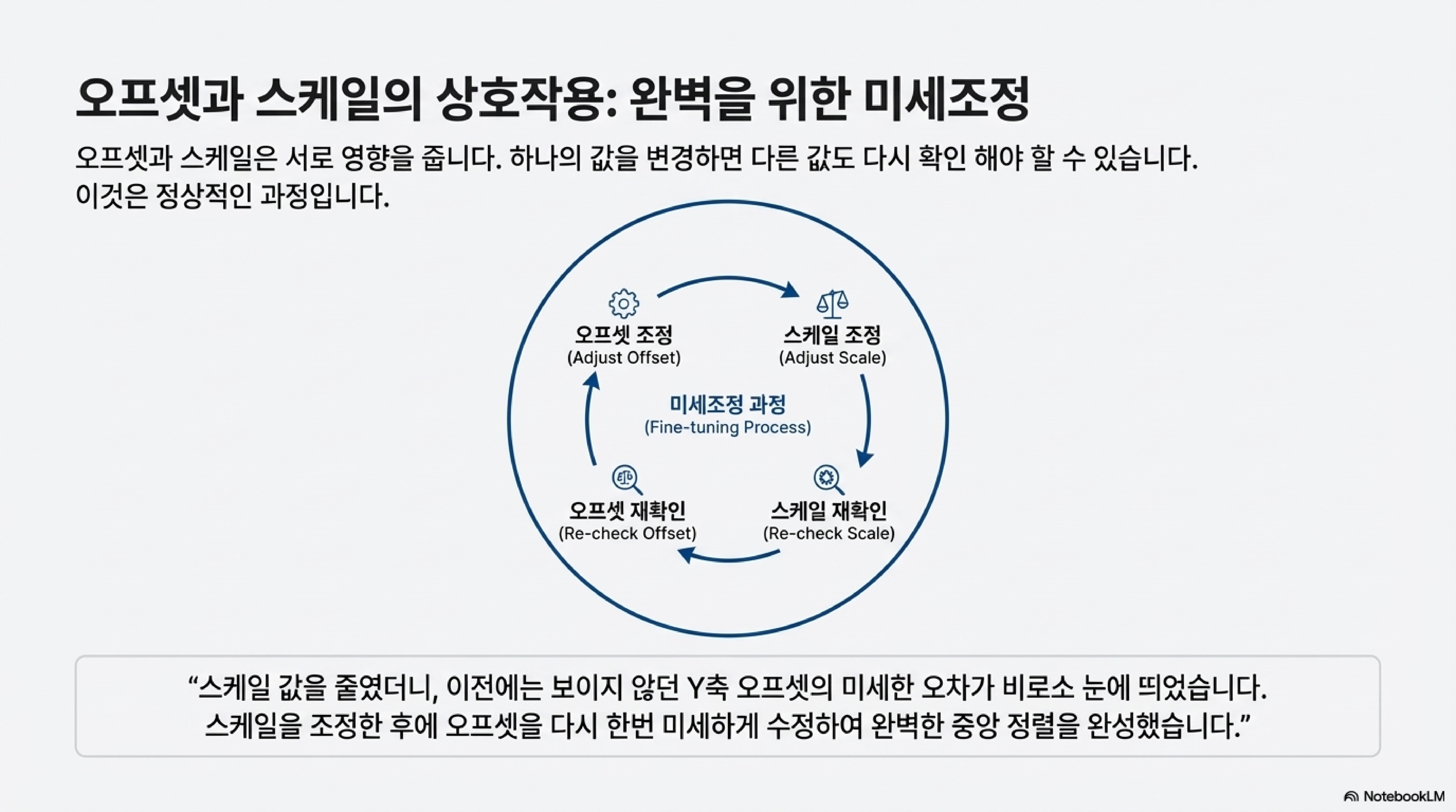 흔히 정렬 작업을 할 때 위치(Offset)를 먼저 맞추고, 그 다음에 크기(Scale)를 맞추면 될 것이라고 생각합니다. 하지만 이는 잘못된 접근법입니다. 레드닷 정렬 과정은 오프셋과 스케일 값이 서로에게 영향을 미치는, 마치 춤을 추듯 반복적인 조정이 필요한 '추측과 확인의 게임(game of guess and check)'과 같습니다. 하나를 조정하면 다른 하나가 미세하게 틀어지기 때문에, 기본값(Offset=0, Scale=1)에서 시작하여 두 설정 사이를 오가며 점진적으로 값을 찾아나가야 합니다. 이 과정이 처음에는 답답하게 느껴질 수 있지만, 원래부터 한 번에 끝나지 않는 작업임을 인지하면 훨씬 수월해집니다.