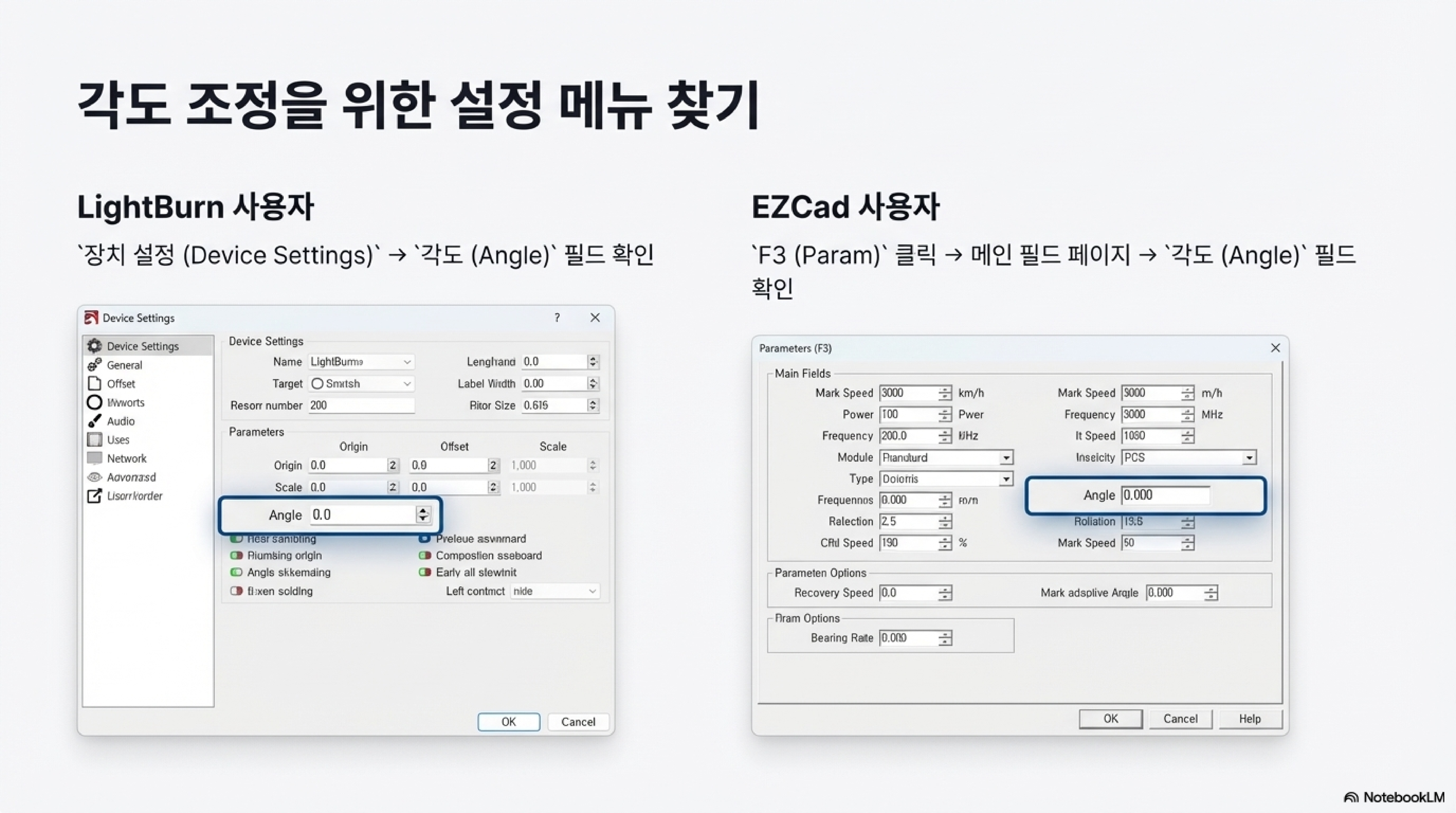 작업대의 지그나 고정 홀에 맞춰 미리보기를 했을 때 각인될 사각형이 비뚤어져 보인다면, 많은 사람들이 레이저 갈보 헤드를 물리적으로 돌려야 한다고 생각합니다. 하지만 이는 장비에 손상을 줄 수 있는 위험하고 부정확한 방법입니다. 이 "물리적인" 문제는 LightBurn이나 EasyCAD 같은 소프트웨어 내의 '각도(angle)' 설정을 통해 안전하고, 반복 가능하며, 수학적으로 정밀하게 해결할 수 있습니다. 위험천만한 물리적 조정 대신 안전하고 확실한 소프트웨어 해법을 선택하는 것, 이것이 바로 전문가의 방식입니다.