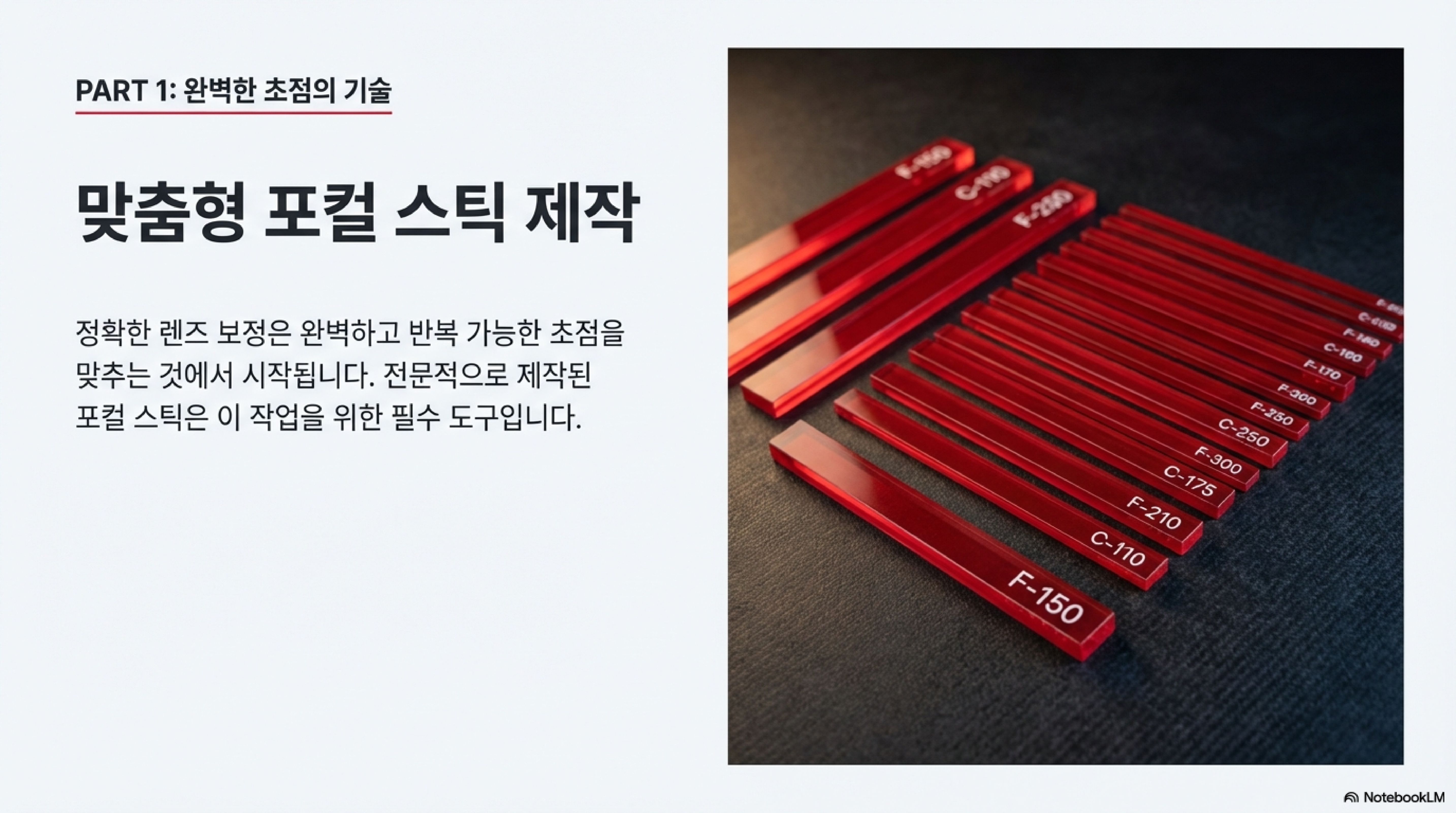 전문가는 정성껏 제작한 각각의 포컬 스틱에 'F 220', 'C 110'과 같은 라벨을 레이저로 새겨 넣습니다. 그리고 그는 이 명명 규칙의 논리를 명확히 설명합니다. "'F'는 초점 거리(Focal length)가 아니라 파이버(Fiber)를 의미합니다. 그래야 이 스틱이 파이버 레이저의 220mm 렌즈용이라는 걸 알 수 있죠."