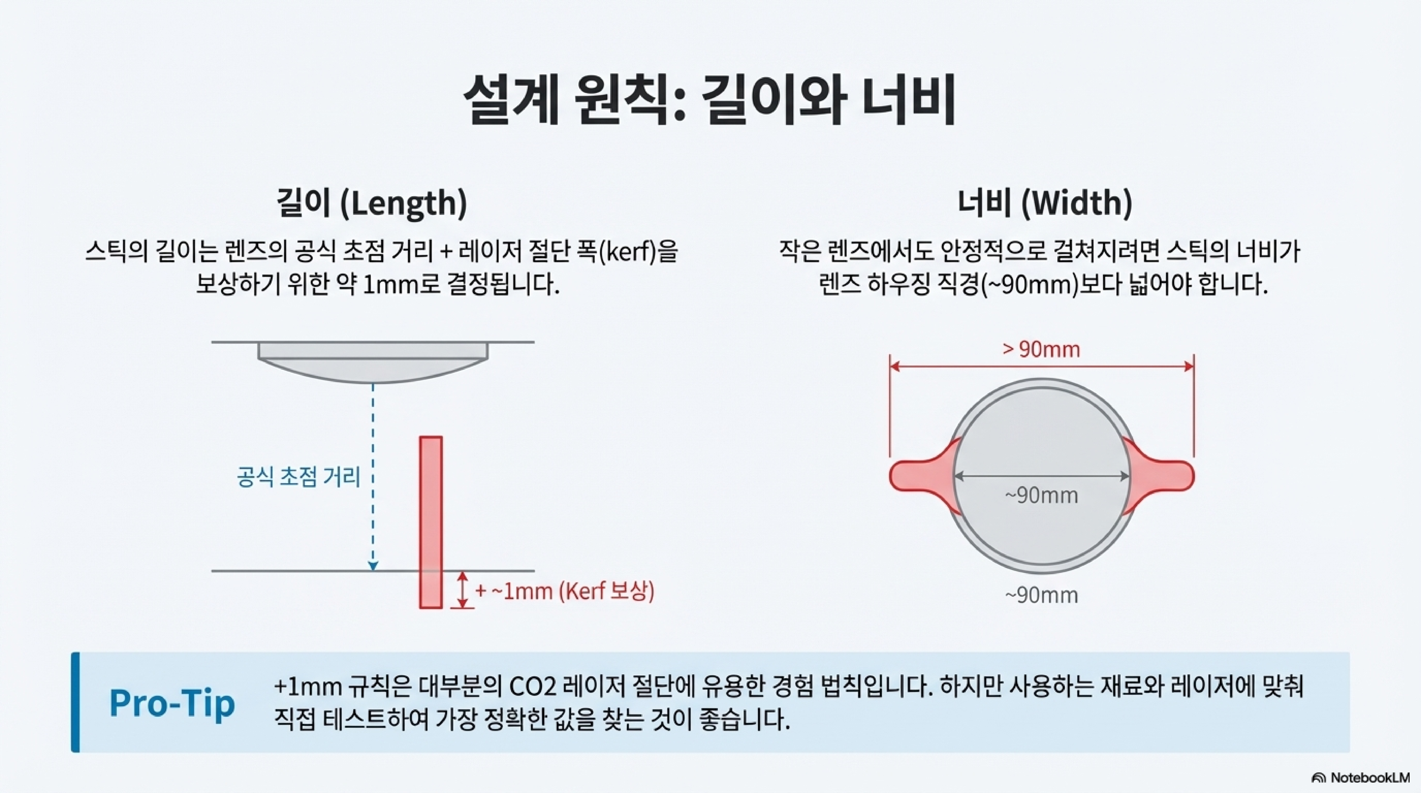 레이저로 재료를 자를 때, 레이저 빔의 두께만큼 재료가 타서 사라지는 '커프(kerf)' 현상이 발생합니다. 이 손실량을 정확히 계산하여 설계에 반영하는 것은 매우 번거로운 일입니다. 영상 속 전문가는 복잡한 계산 대신 놀랍도록 간단한 경험칙을 사용합니다. 바로 원하는 길이보다 '1밀리미터 더 크게' 만드는 것입니다.