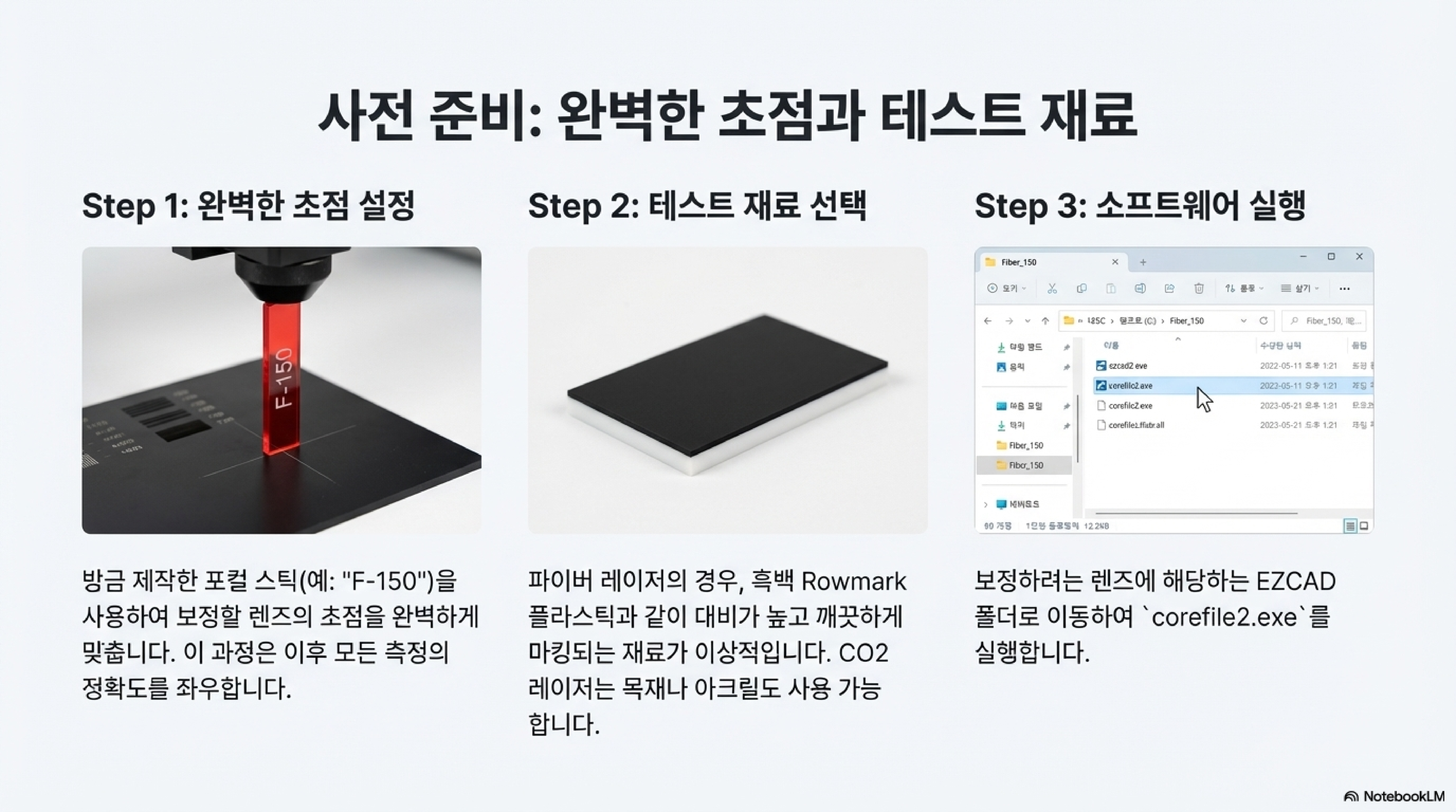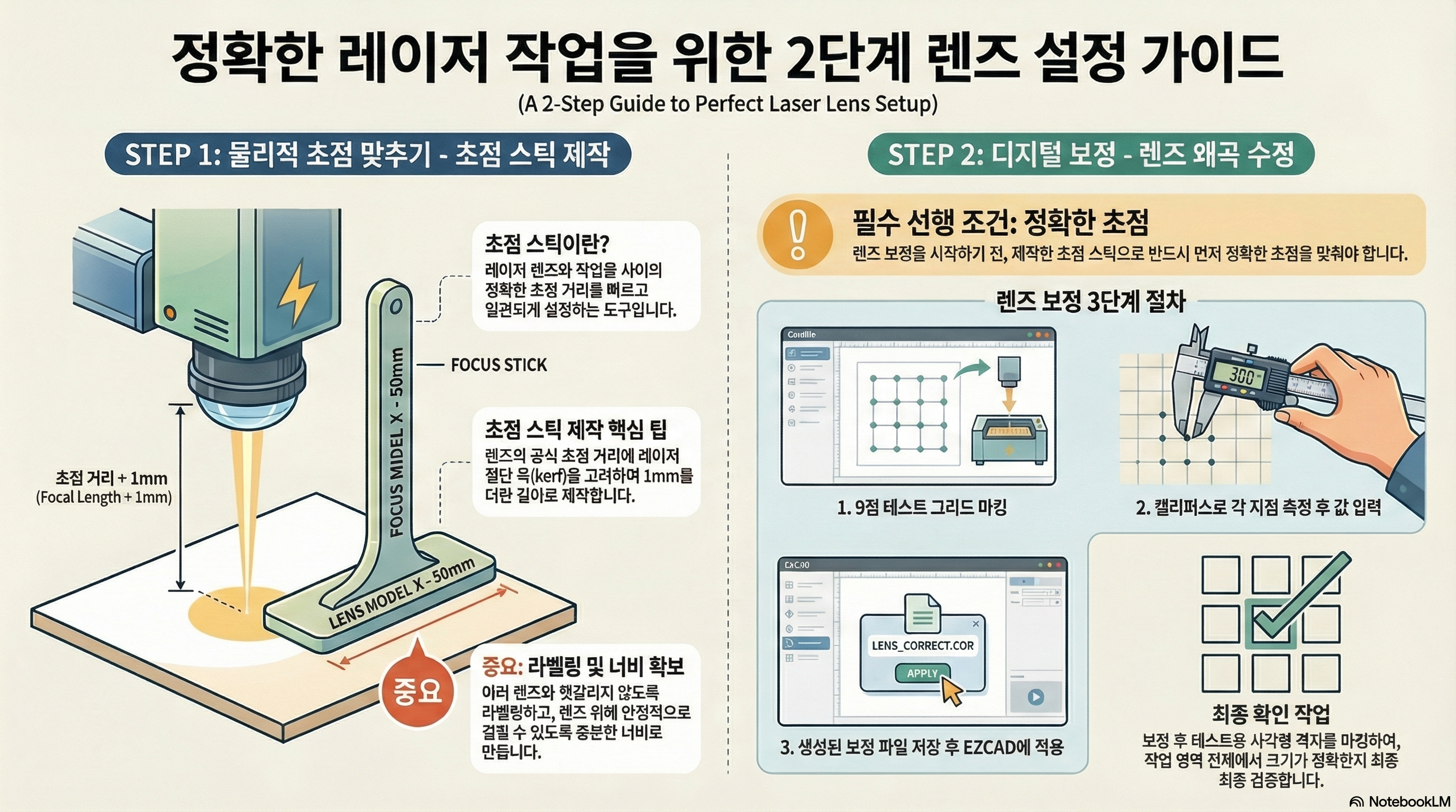 '포컬 스틱(Focal Stick)'은 레이저 렌즈의 정확한 초점 거리를 맞추기 위해 사용하는 물리적인 막대입니다. 영상 속 전문가는 소프트웨어 보정을 시작하기에 앞서, 직접 제작한 포컬 스틱으로 각 렌즈의 물리적 초점부터 완벽하게 맞춥니다. 이 과정이 왜 중요할까요? 초점이 정확하지 않으면, 이후에 소프트웨어로 측정하고 보정하는 모든 데이터가 처음부터 틀어진 값에 기반하게 되기 때문입니다. 즉, 포컬 스틱을 이용한 아날로그적인 초점 설정은 모든 디지털 보정의 정확성을 담보하는 가장 기본적인 선행 조건입니다.