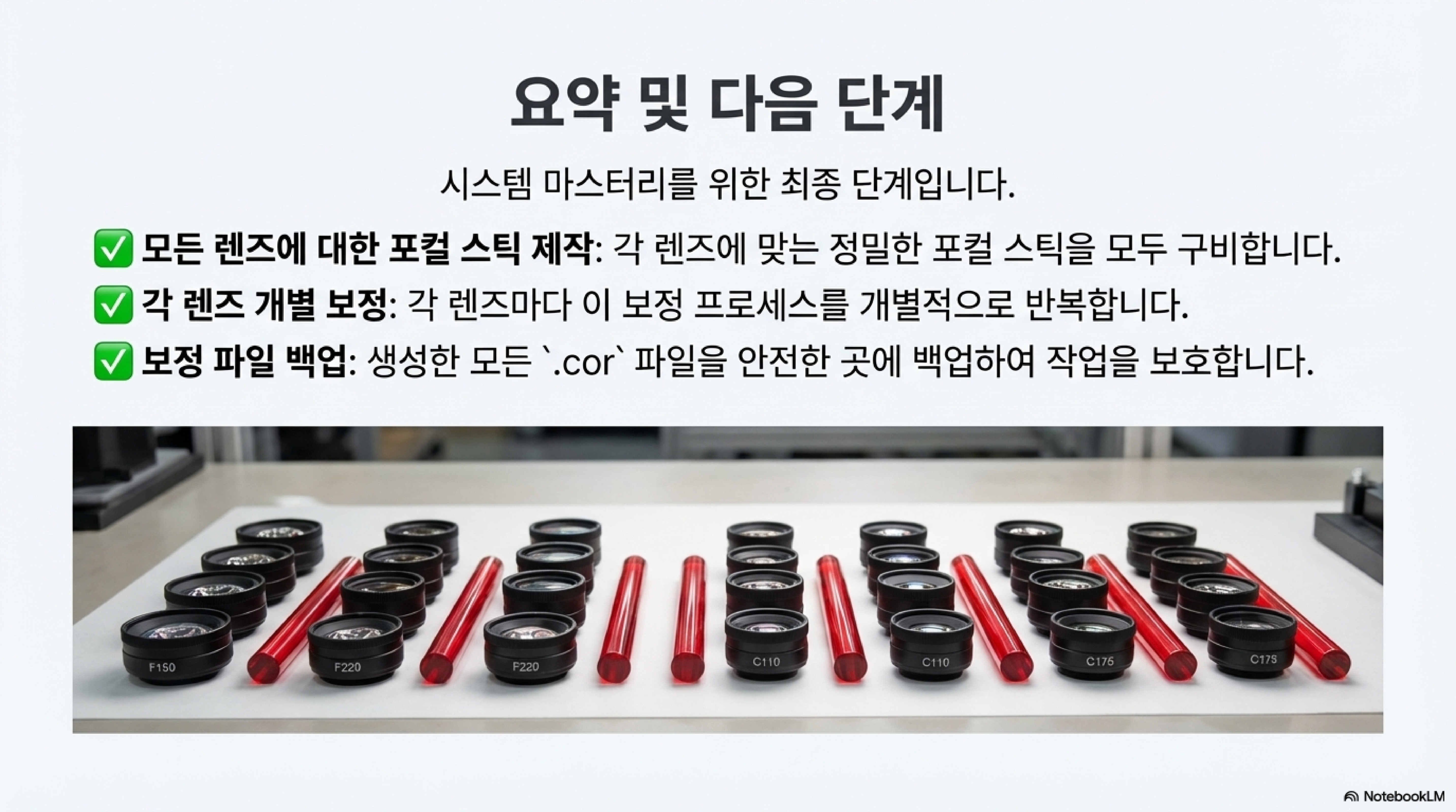 이것은 단순한 정리 습관이 아닙니다. 여러 장비와 렌즈를 사용하는 환경에서 발생할 수 있는 치명적인 실수를 원천 차단하는 핵심적인 안전장치입니다. 그는 "CO2 포컬 스틱과 섞이면 안 되기 때문"이라고 강조합니다. 이처럼 체계적인 시스템을 구축하고 그 만족감을 숨기지 않는 모습("이거 정말 멋지네요", "낡은 것들을 버리니 속이 다 시원하네요")은 프로의 작업이 단순한 기능 수행을 넘어, 잘 정돈된 시스템에서 오는 안정감과 희열을 동반한다는 것을 보여줍니다. 사소해 보이는 라벨링 하나가 아마추어와 프로를 가르는 결정적인 차이를 만듭니다.
