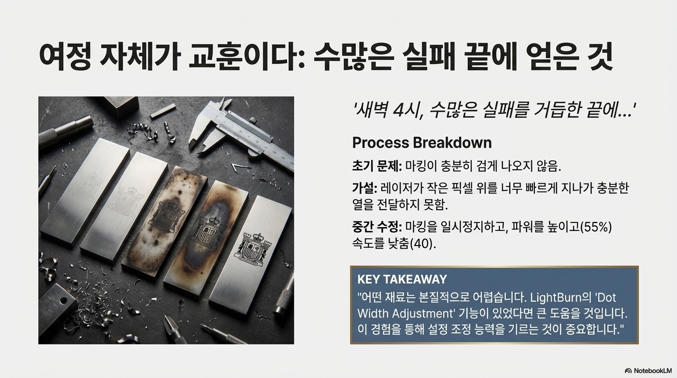 여기서 포기하는 대신, 전략을 180도 전환했습니다. 이미지를 반전시켜(invert) 밝은 '네거티브' 이미지로 각인하는 방법을 시도한 것입니다. 하지만 그것이 끝이 아니었습니다. 이미지를 반전시킨 후에도 실수로 '슬레이트 화이트(slate white)' 설정을 사용하여 여전히 희미한 결과물을 얻었습니다. 이것이 바로 전문가의 문제 해결 과정이 빛을 발하는 순간입니다. 변수를 체계적으로 점검한 끝에, '스틸 화이트(steel white)'라는 올바른 설정을 찾아 적용했고, 마침내 매우 만족스러운 흰색 각인 결과물을 얻을 수 있었습니다. 이 경험은 실패가 끝이 아니라, 새로운 가능성을 여는 전환점이 될 수 있음을 보여줍니다.