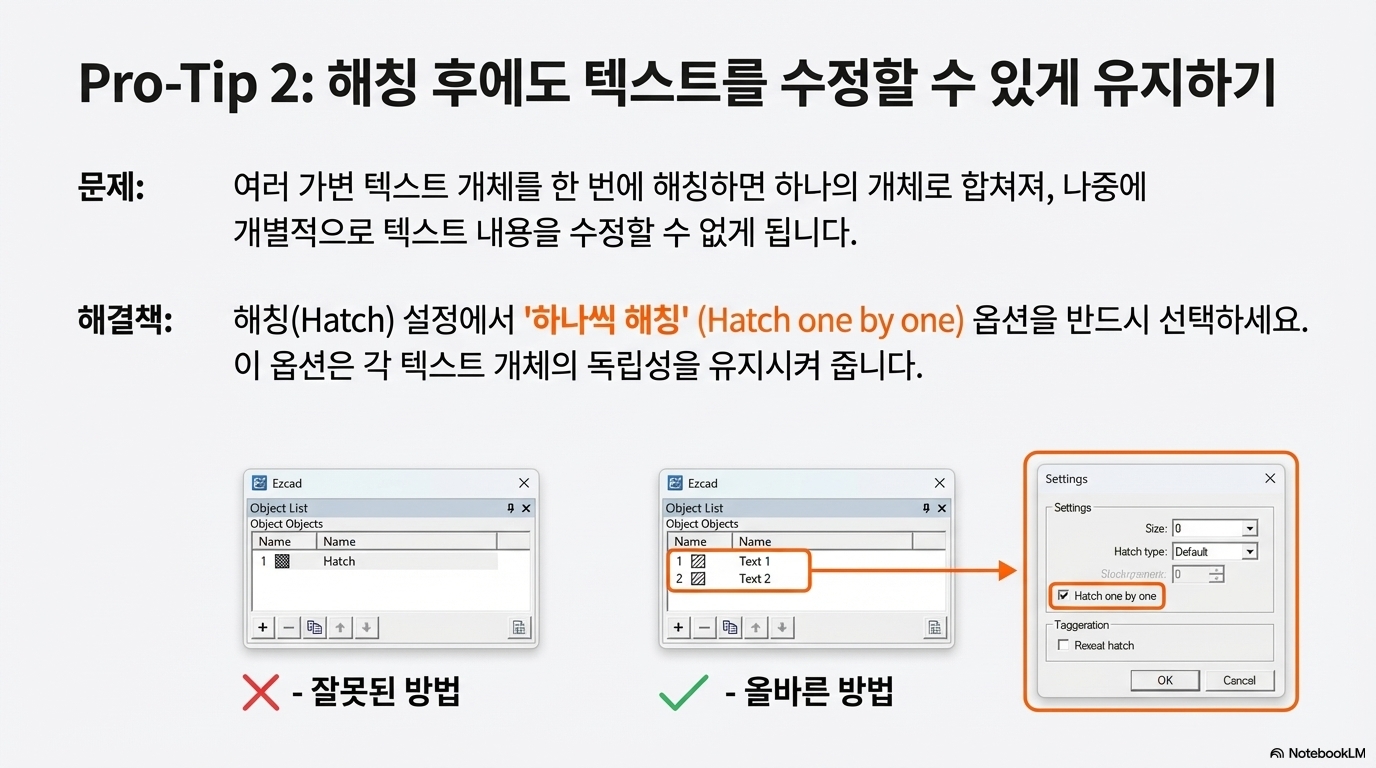 - '하나씩 해치' 사용 시: 해칭 후에도 여전히 여러 개의 독립된 텍스트 객체가 살아있어 언제든 개별 수정이 가능합니다.