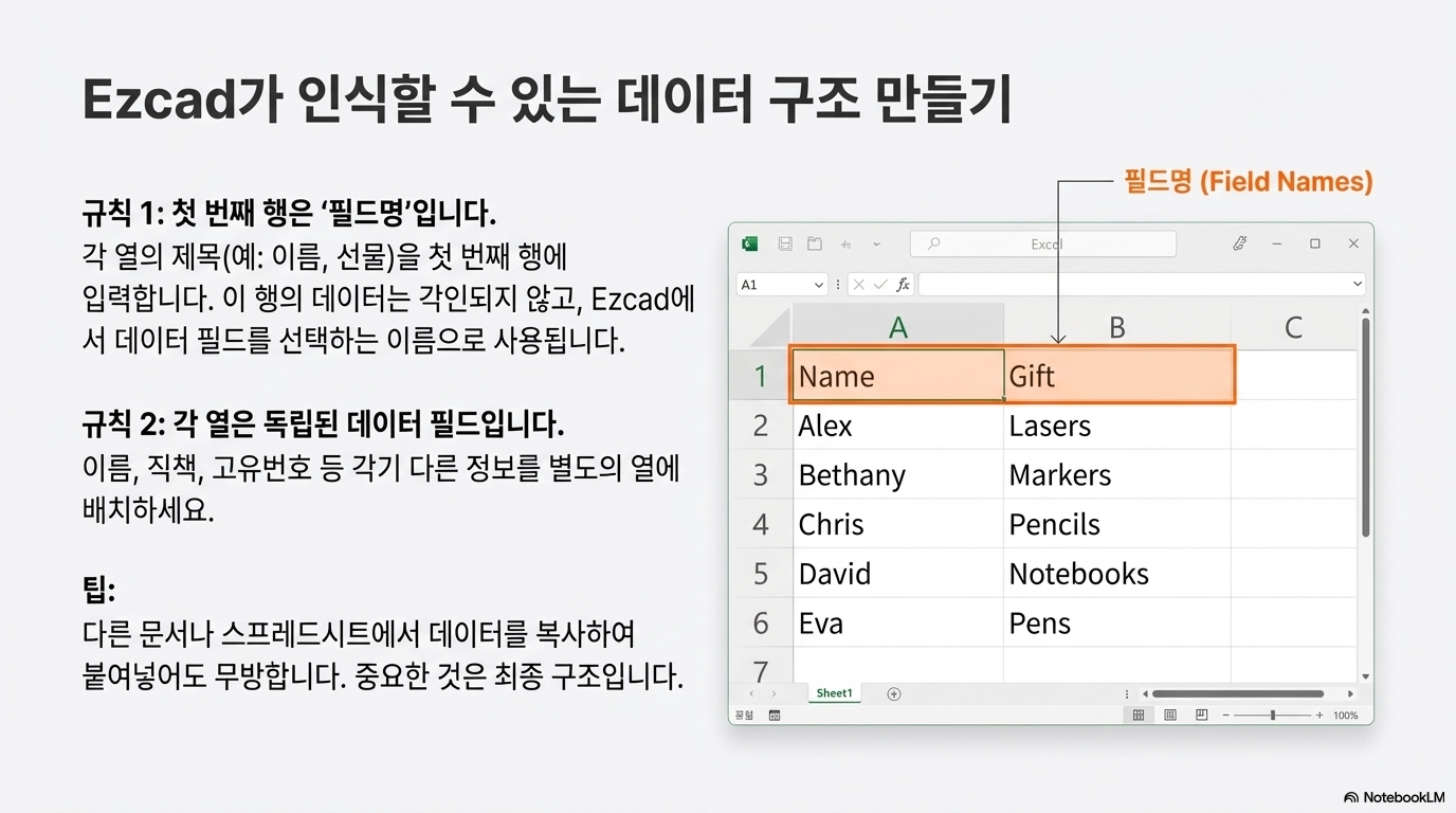 첫째, 엑셀 시트의 첫 번째 행은 반드시 '헤더(Header)' 즉, 열의 제목으로 사용해야 합니다. 예를 들어 '이름', '직책'과 같이 각 열에 들어갈 데이터의 종류를 첫 행에 입력하세요. Ezcad는 이 첫 행의 데이터를 각인하지 않고, 변수 텍스트의 '필드 이름'으로 사용합니다. 이 규칙을 지키지 않으면 데이터가 엉뚱하게 불려오거나 첫 번째 줄의 데이터를 사용할 수 없게 됩니다.