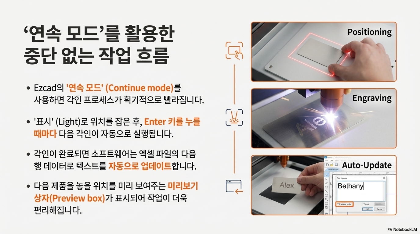 수십, 수백 개의 제품에 연속으로 다른 내용을 각인해야 할 때, 제가 반드시 사용하는 '최종 병기'가 바로 **'연속 모드(Continue mode)'**입니다.