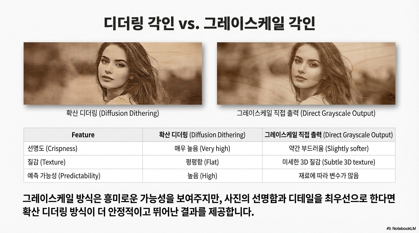 이것이 왜 중요할까요? 대부분의 사람들은 DPI 숫자 자체에만 집중하지만, 레이저 각인에 필요한 정밀한 디테일은 결국 '얼마나 많은 픽셀을 가지고 시작하는가'에 달려있기 때문입니다. 총 픽셀이 부족한 작은 이미지를 억지로 키워 DPI를 높이면, 이미지는 선명해지는 것이 아니라 "죽처럼 뭉개질" 뿐입니다. 원본이 가진 픽셀 총량이 많아야만, 이미지를 압축하고 조정해도 품질 손실 없이 디테일을 유지할 수 있습니다.