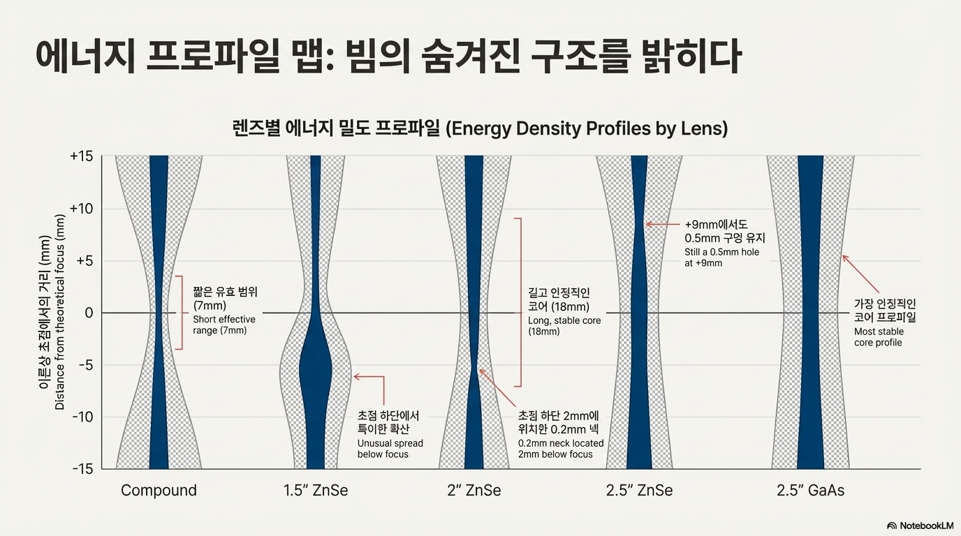 이는 레이저 커팅 시 초점을 완벽하게 맞추지 못하더라도, 이 강력한 에너지 코어 덕분에 여전히 상당한 가공 능력을 발휘할 수 있다는 실용적인 팁을 시사합니다. 이 테스트 결과를 바탕으로 그려진 에너지 밀도 맵은 마치 빔의 중심을 관통하는 강력한 에너지 기둥처럼 보이는 이 코어의 존재를 명확하게 시각적으로 보여줍니다.